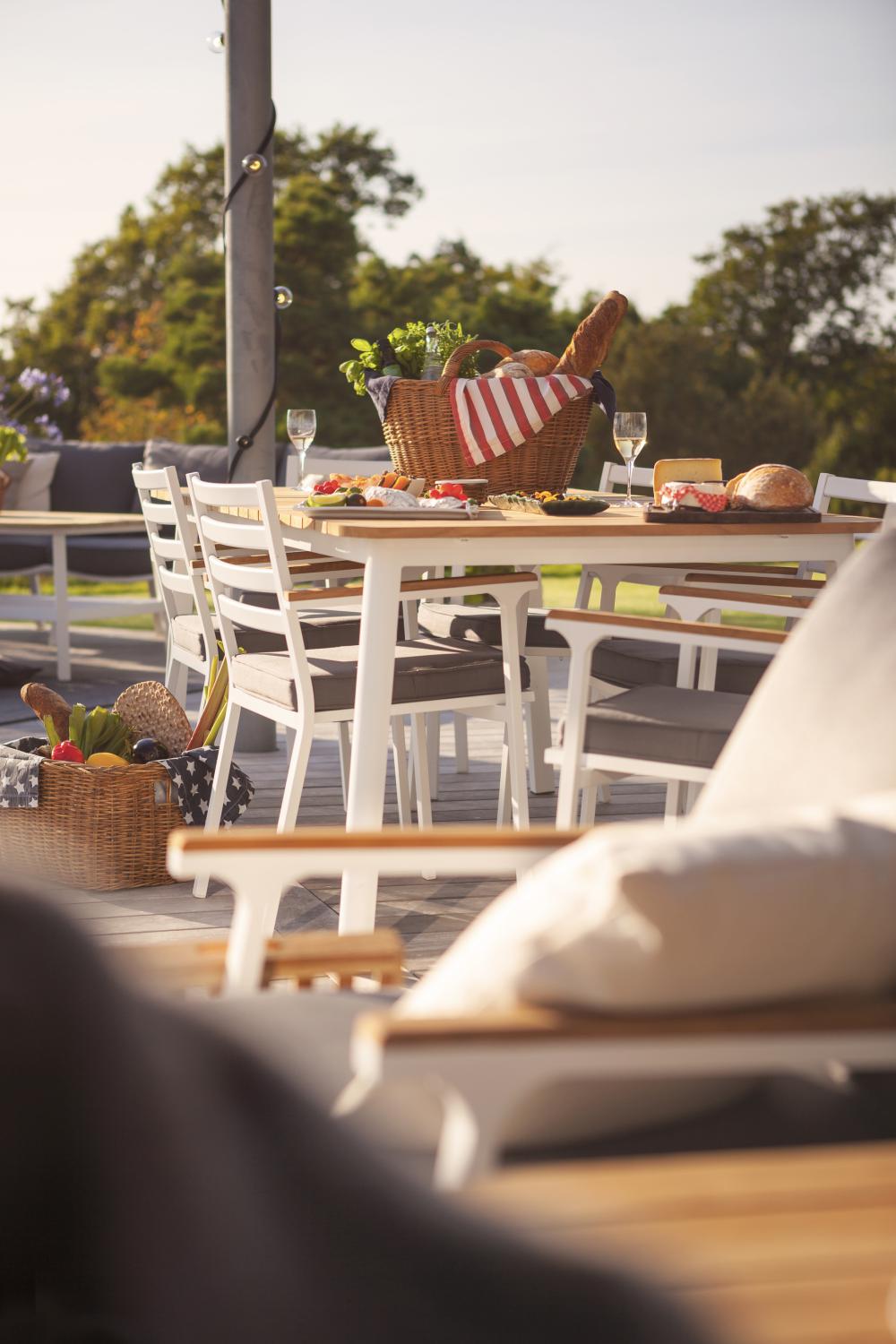 Barbord för utomhusbruk i vit aluminium med med detaljer i kvalitetsteak. Barstol för utomhusbruk i vit aluminium med med detaljer i kvalitetsteak och hög komfort tack vare svängda ryggpartier och formskurna olefindynor i grått. Olivet är en serie med inspiration från 60-talet.