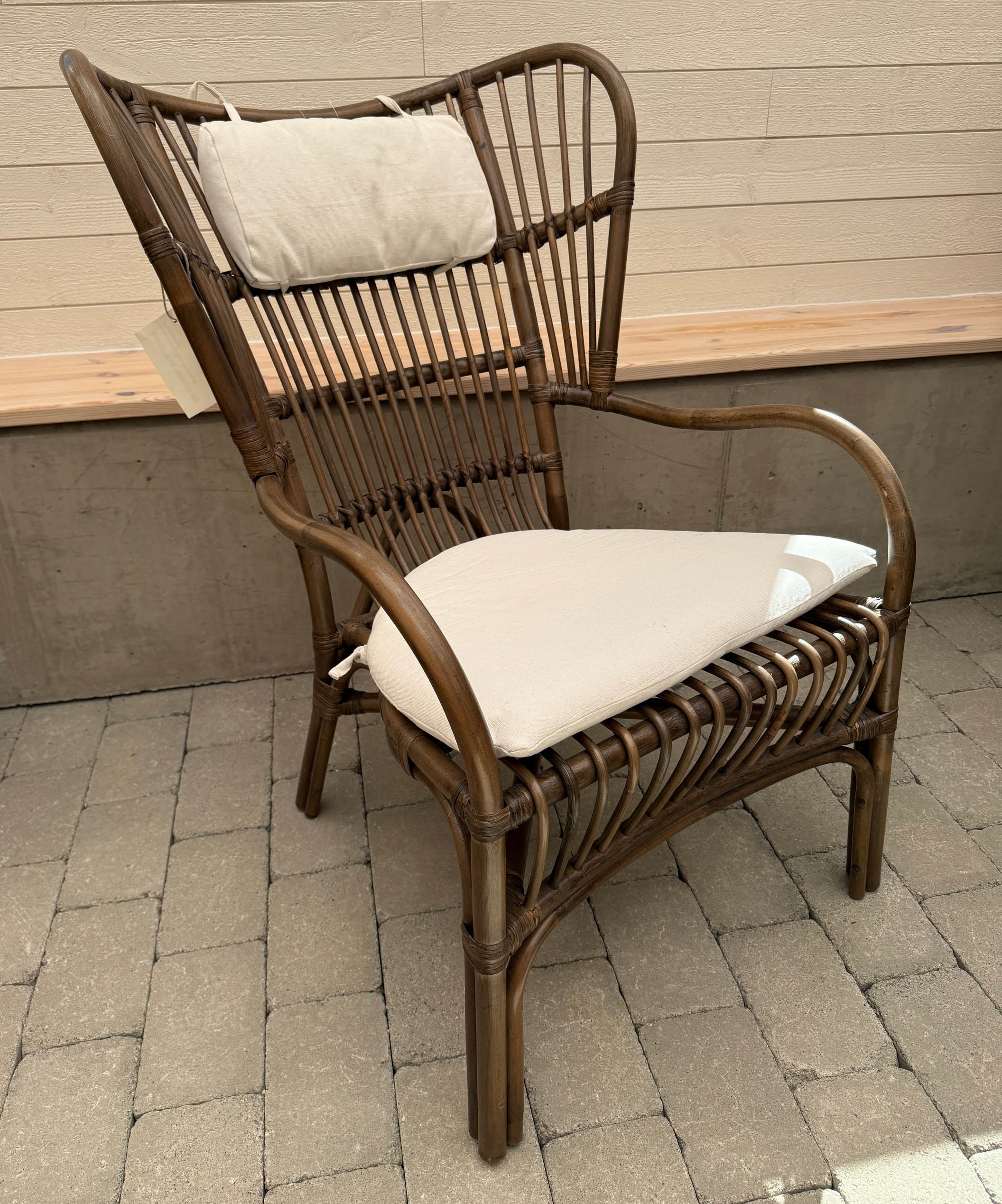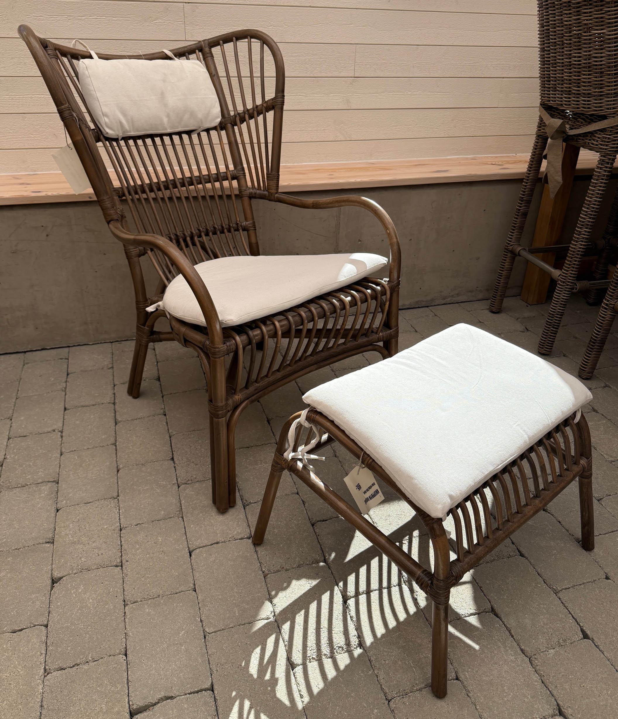Fåtölj i brun rotting med sittdyna och nackkudde i ljust tyg. Kombinera gärna med fotpallen i samma serie.