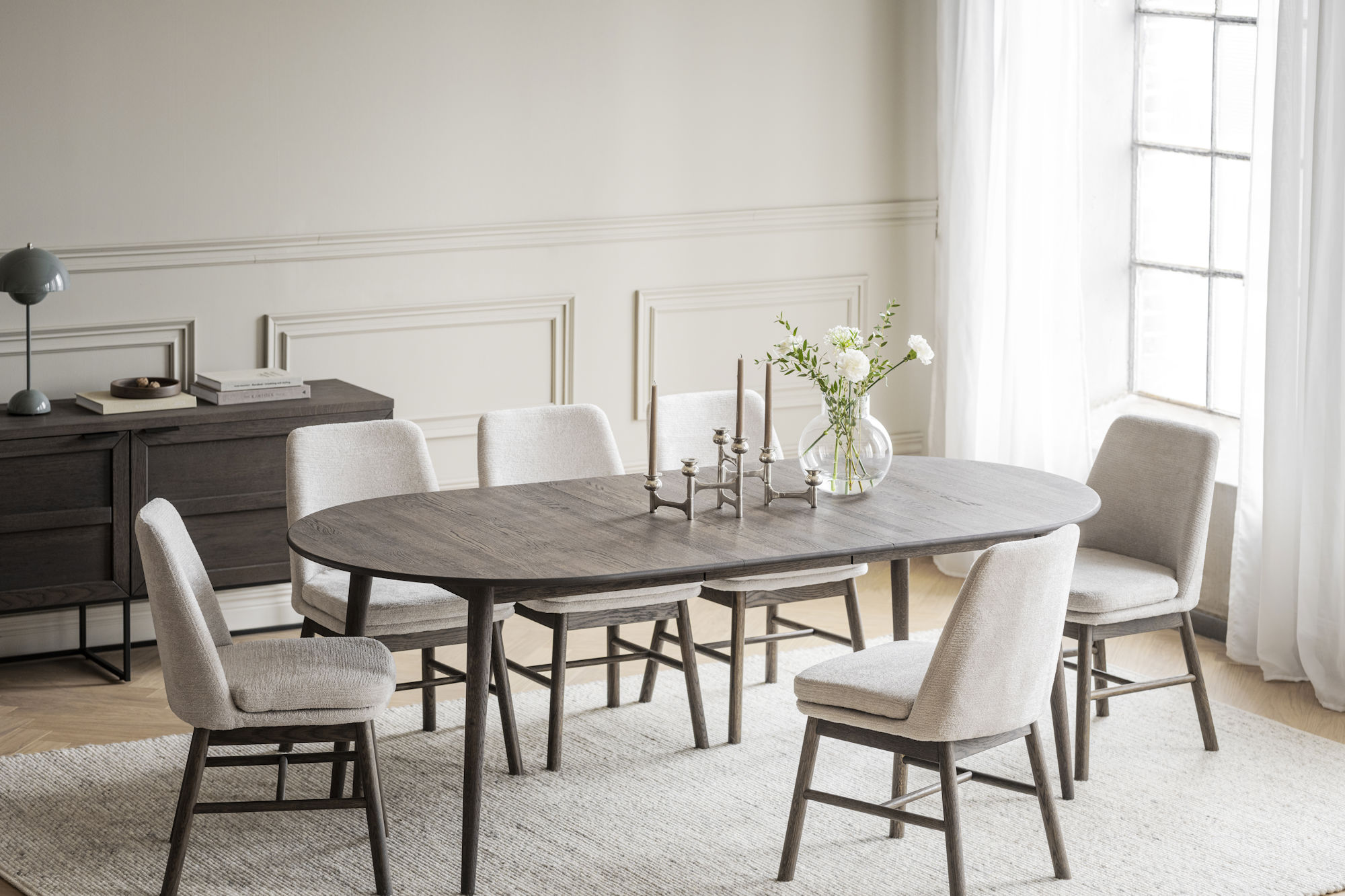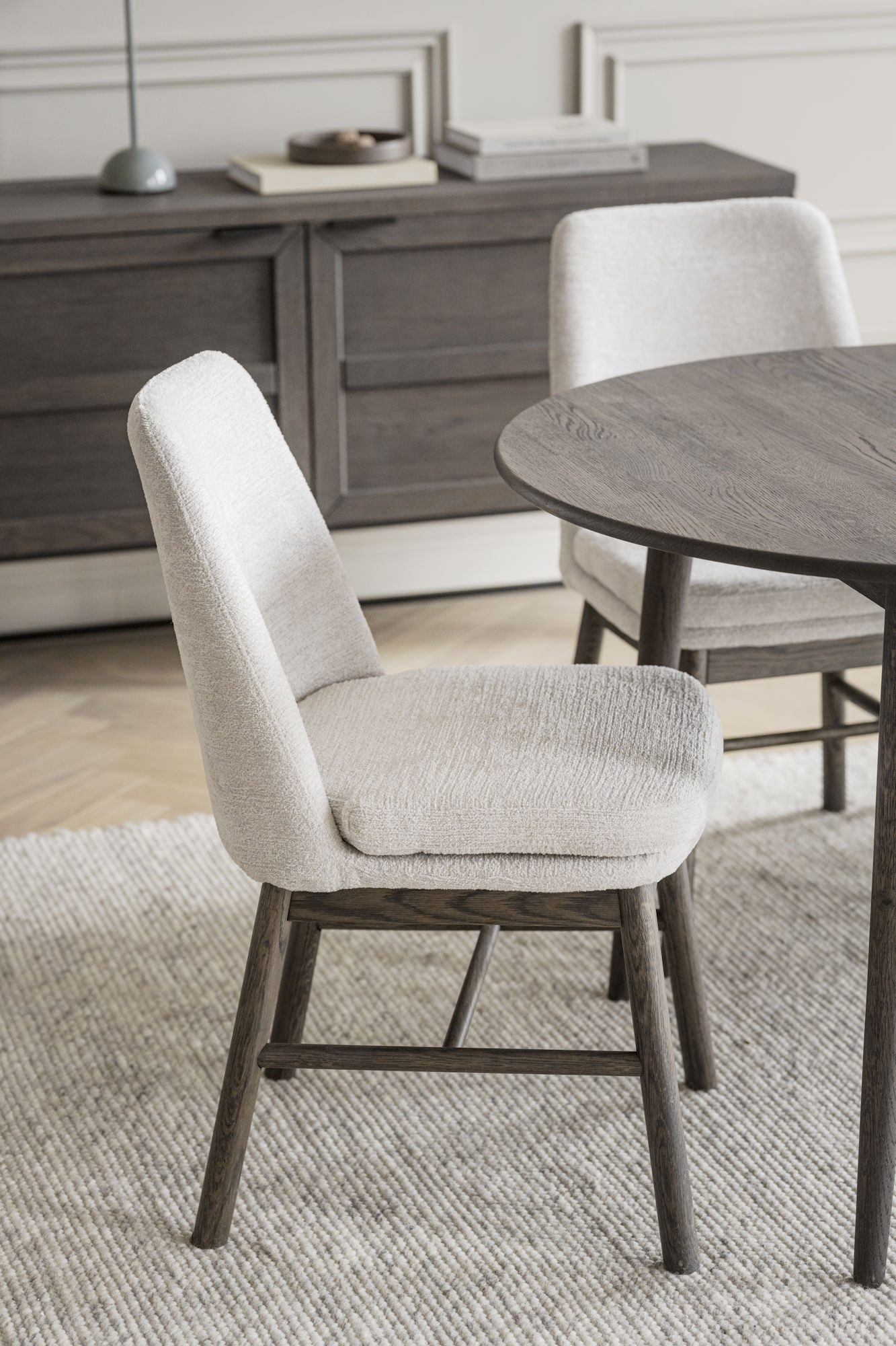 Amesbury stol med svarvade massiva träben i brunlackad ek ger en naturlig elegans till ditt hem. Stolen är klädd med ljusbeige tyg som har fin struktur och är otroligt mjukt, samtidigt som det är väldigt slitstarkt. Tack vare den tjocka dynan, som dessutom är löstagbar, kan du sitta bekvämt under långa middagar och njuta av varje ögonblick. Finns även med träben i vitpigmenterad ek samt lackad ek.