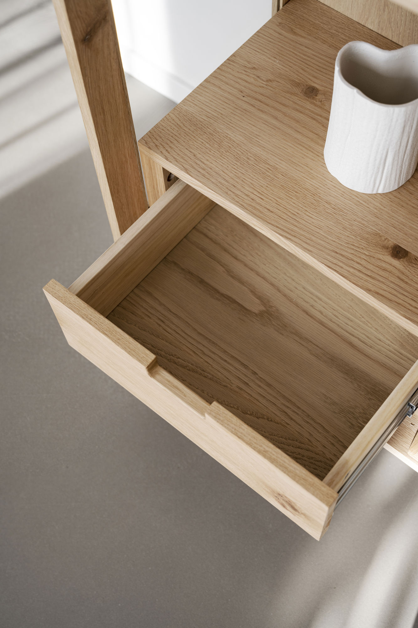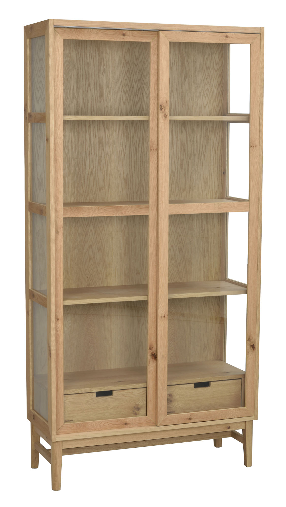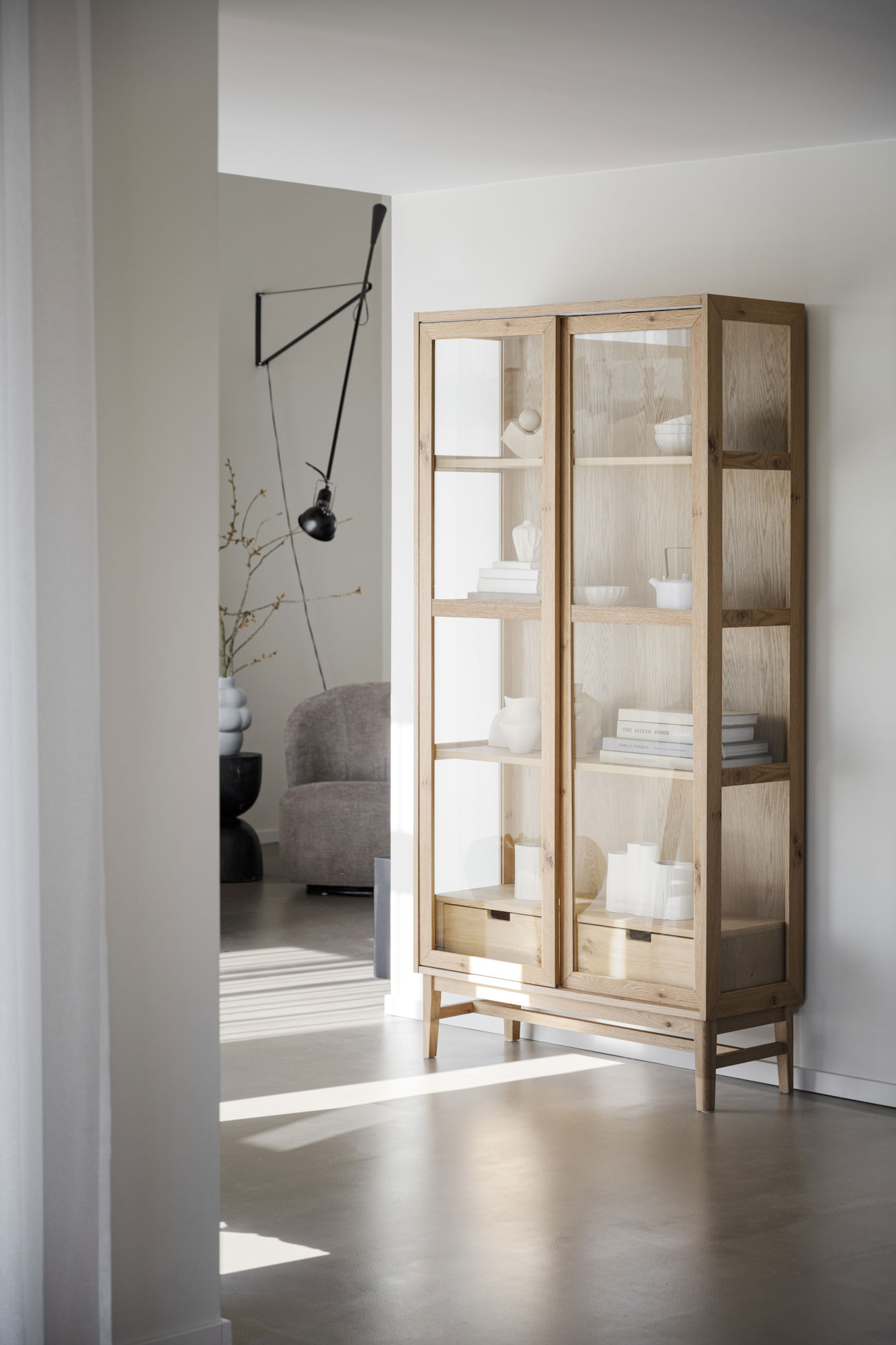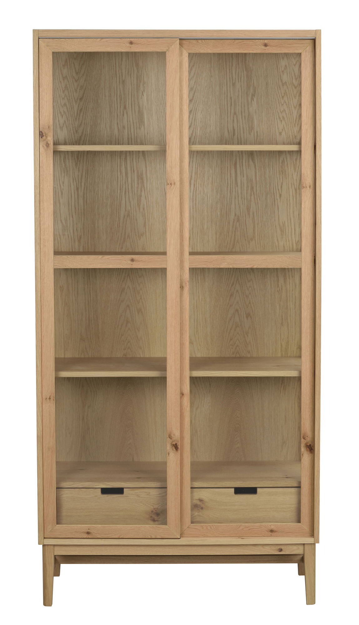 Hazelton vitrinskåp med stomme i oljad FSC®-certifierad ek och generöst ljusinsläpp från glaspartierna framifrån och på sidorna blir en imponerande möbel oavsett var i rummet den placeras. Det rymliga skåpet har praktiska skjutdörrar, tre fasta hyllplan samt två mjukstängande förvaringslådor längst ner för extra utrymme. Perfekt för att visa upp glas, böcker eller inredningsdetaljer men ändå kunna gömma undan vissa vardagsartiklar. Kombinera gärna med Hazelton sideboard i samma färg eller Plainfield matbord med matchande bordsben för en enhetlig stil. Finns även i brunoljad ek.