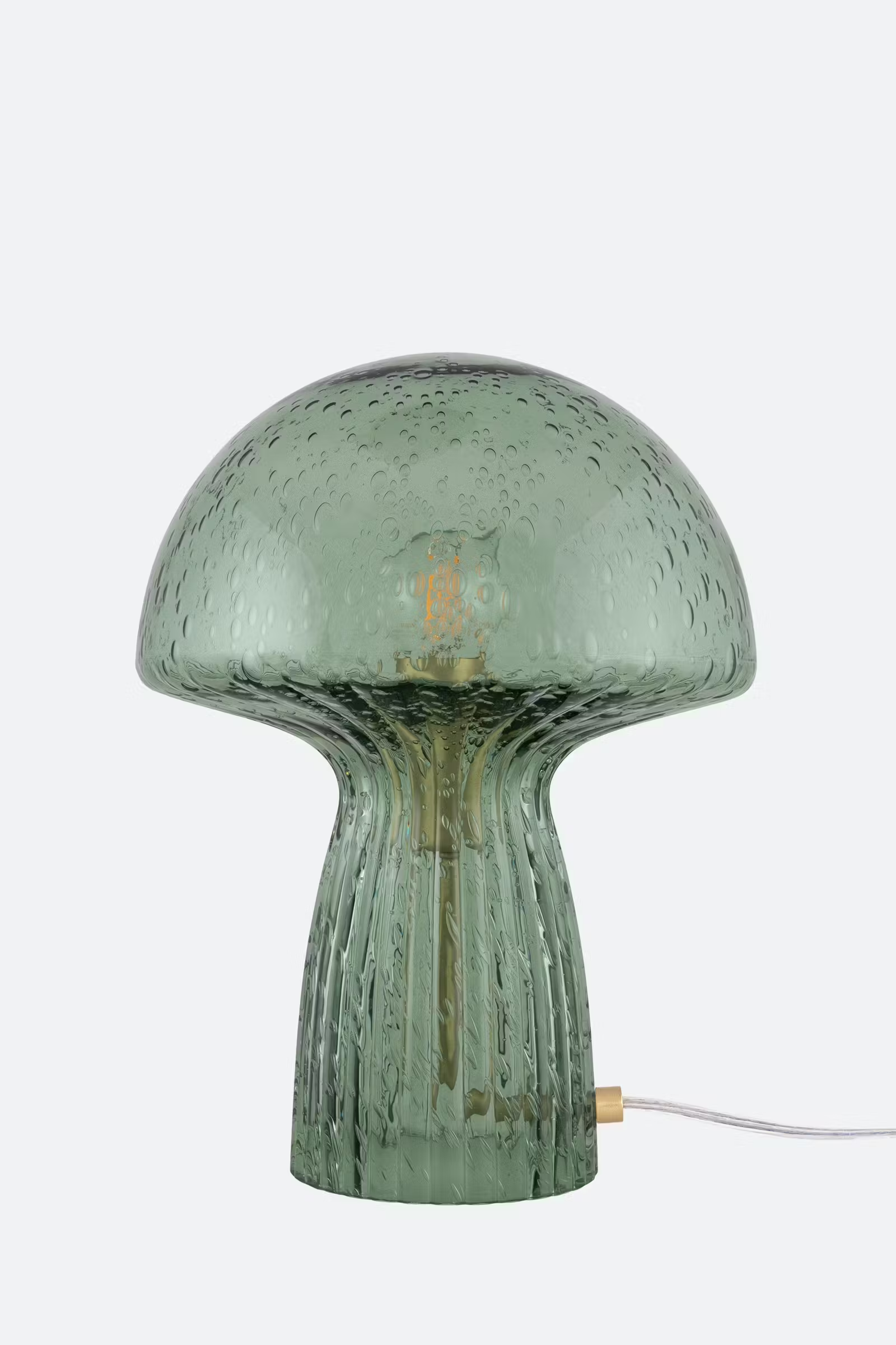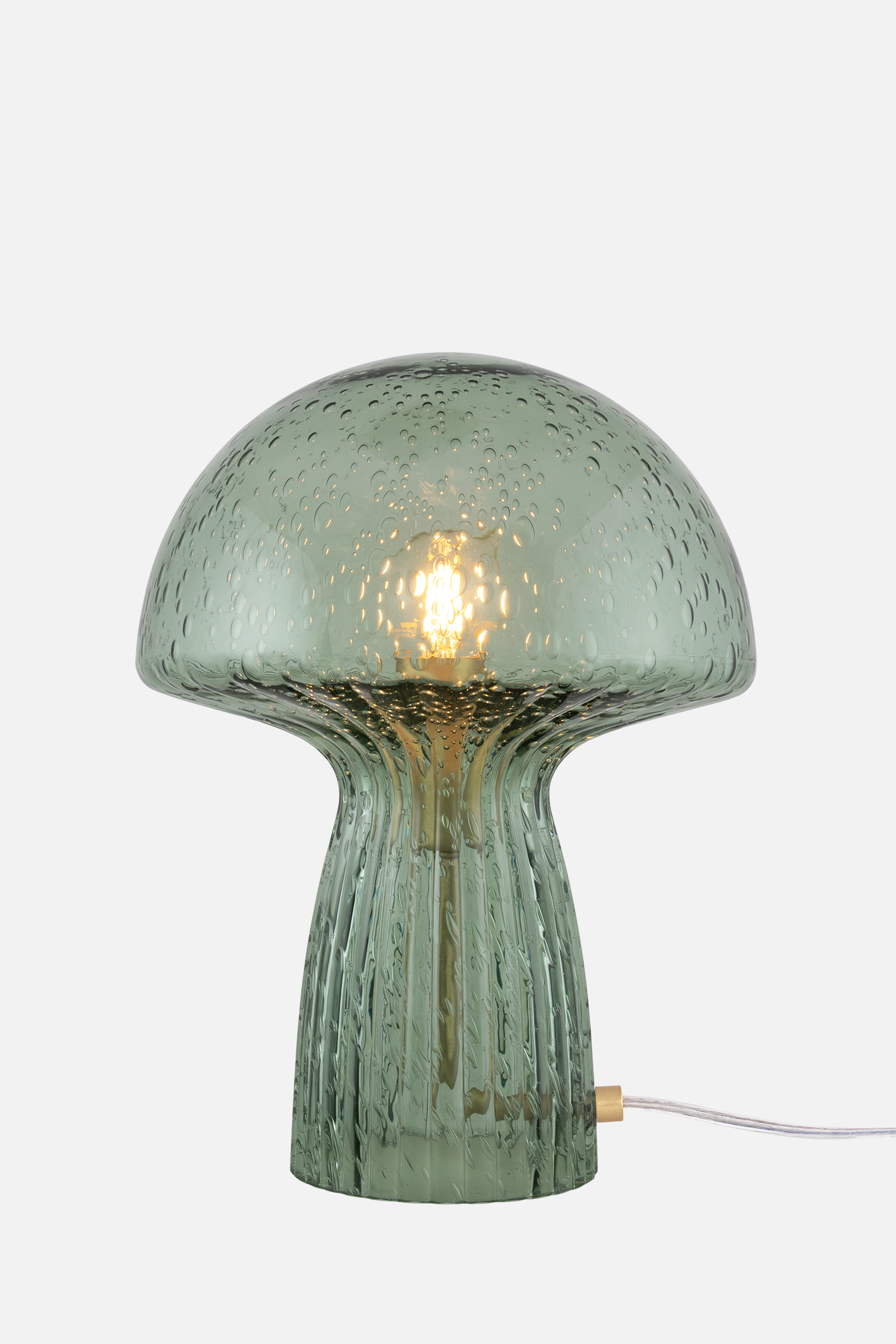 Inspirerad av skogen kommer denna lilla bordslampa avbildad som en svamp. Den är gjord av grönt glas med gevär på foten där gevären går hela vägen upp under hatten som skivorna på en svampsvamp. Lampan har många vackra små luftbubblor i glaset som ger en mysig stämning när ljuset är på. Fungo Special Edition 22 är en medelstor bordslampa som passar perfekt i fönstret, på en skänk eller en hylla. Fungo har en kontrasterande lamphållare i borstad mässingsfärgad metall och en 200 cm lång transparent kabel med transparent strömbrytare och Europlugg.