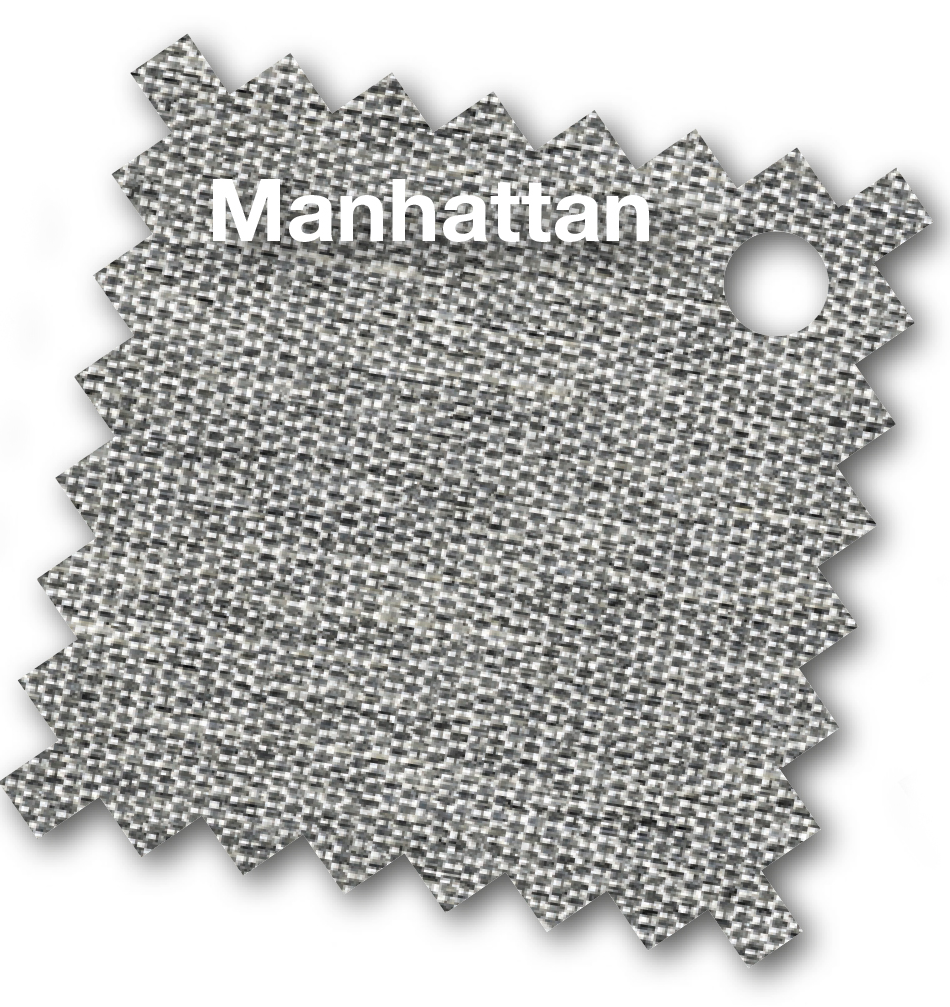 Det lyxiga flerfärgade 240 grams Spuncrylic premiumtyget i färgen Manhattan förblir estetiskt tilltalande under lång tid, är färgäkta och erbjuder optimalt skydd mot solen; upp till 98% UV-skydd. Tyget är försett med en vatten- och smutsavvisande beläggning och dragfjädrar.