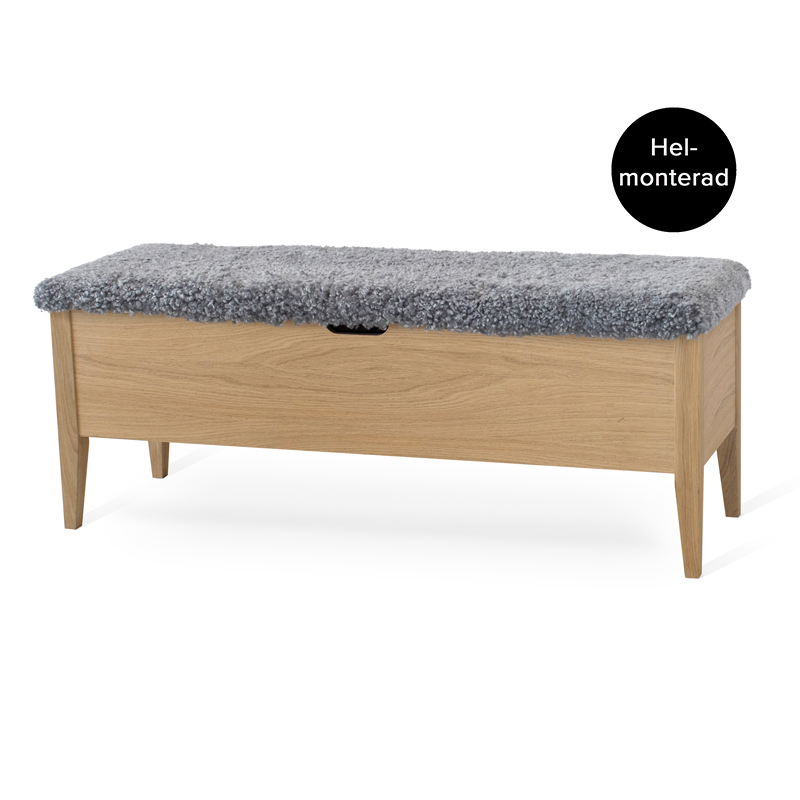 Välj mellan olika klädslar på toppen – grå fårskinnsimitation, äkta fårskinn, ljusgråa tyget Chelsea eller bruna tyget Abriamo. På insidan av bänken finns ett rymligt fack med en praktisk skiljevägg, som även går att tas bort för att göra plats för större föremål.