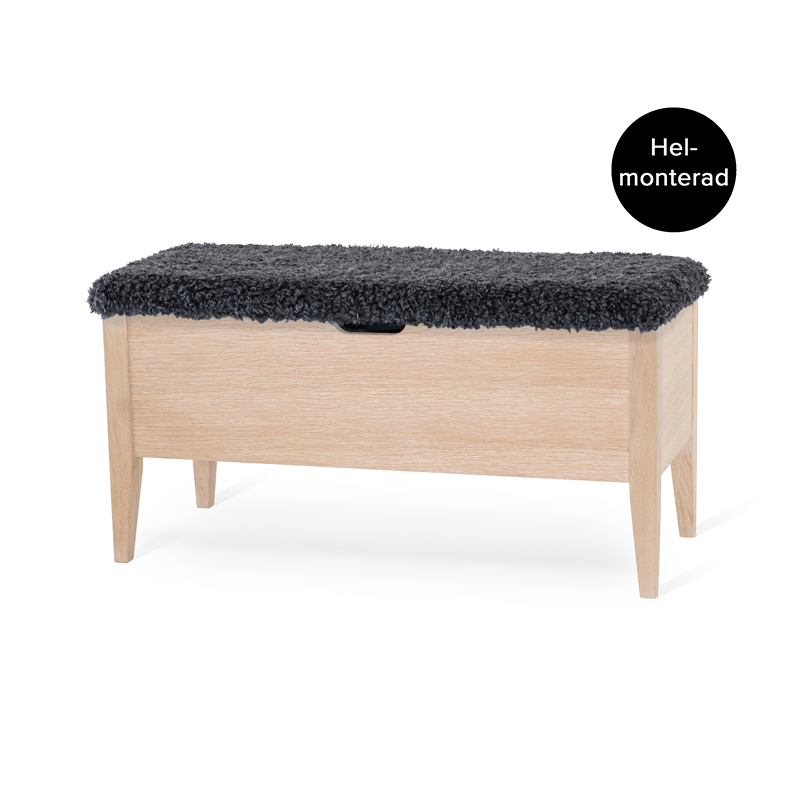 Välj mellan olika klädslar på toppen – grå fårskinnsimitation, äkta fårskinn, ljusgråa tyget Chelsea eller bruna tyget Abriamo. På insidan av bänken finns ett rymligt fack med en praktisk skiljevägg, som även går att tas bort för att göra plats för större föremål.
