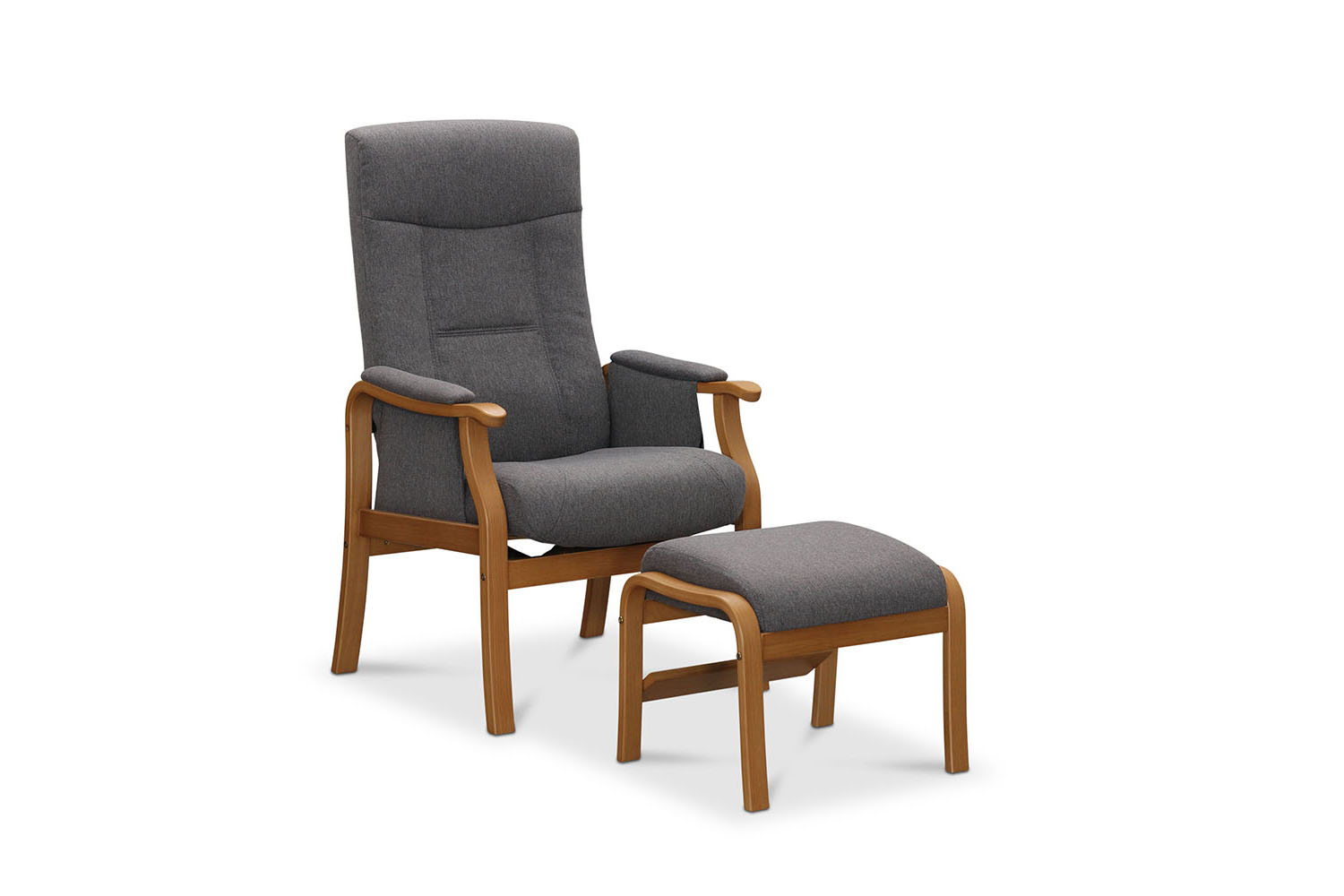Bergen seniorfåtölj med fotpall i grått tyg. Benen är i ek. Fåtöljen har en manuellt justerbar rygg. Tillhörande fotpall ger skön avlastning för ben och fötter.