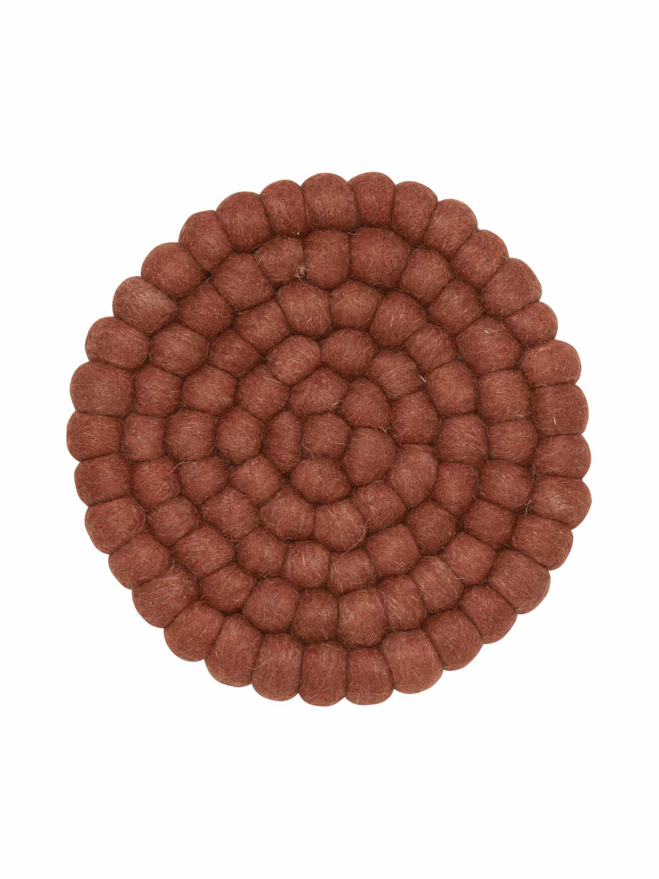 Grytunderlägg i ull med tovade bollar, för att skydda bordet mot varma kärl.