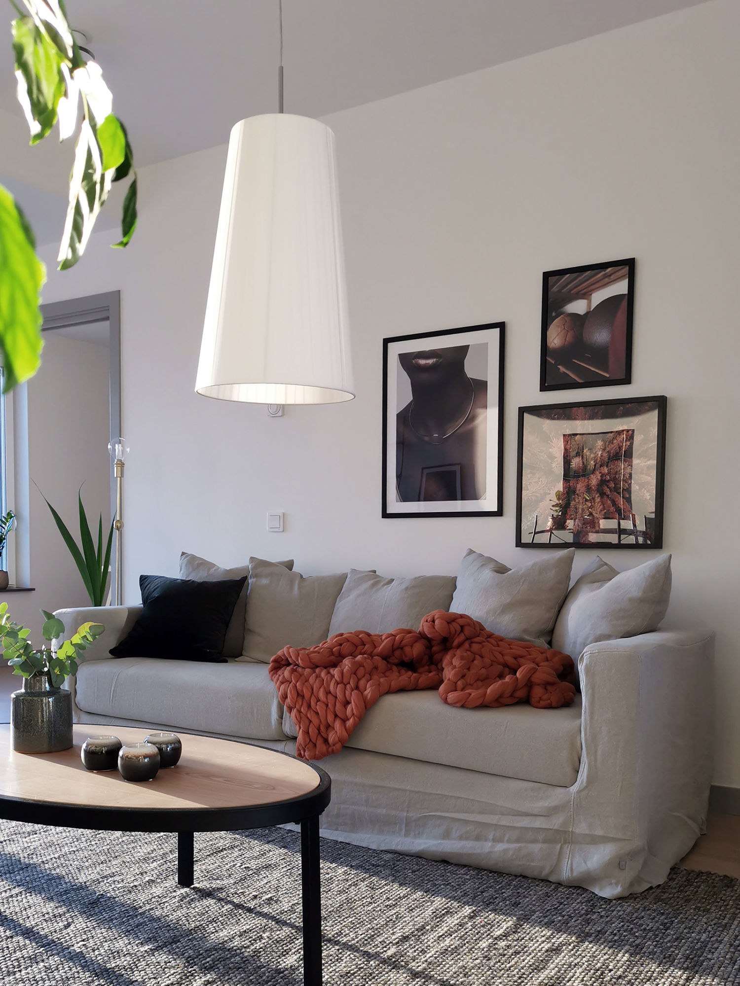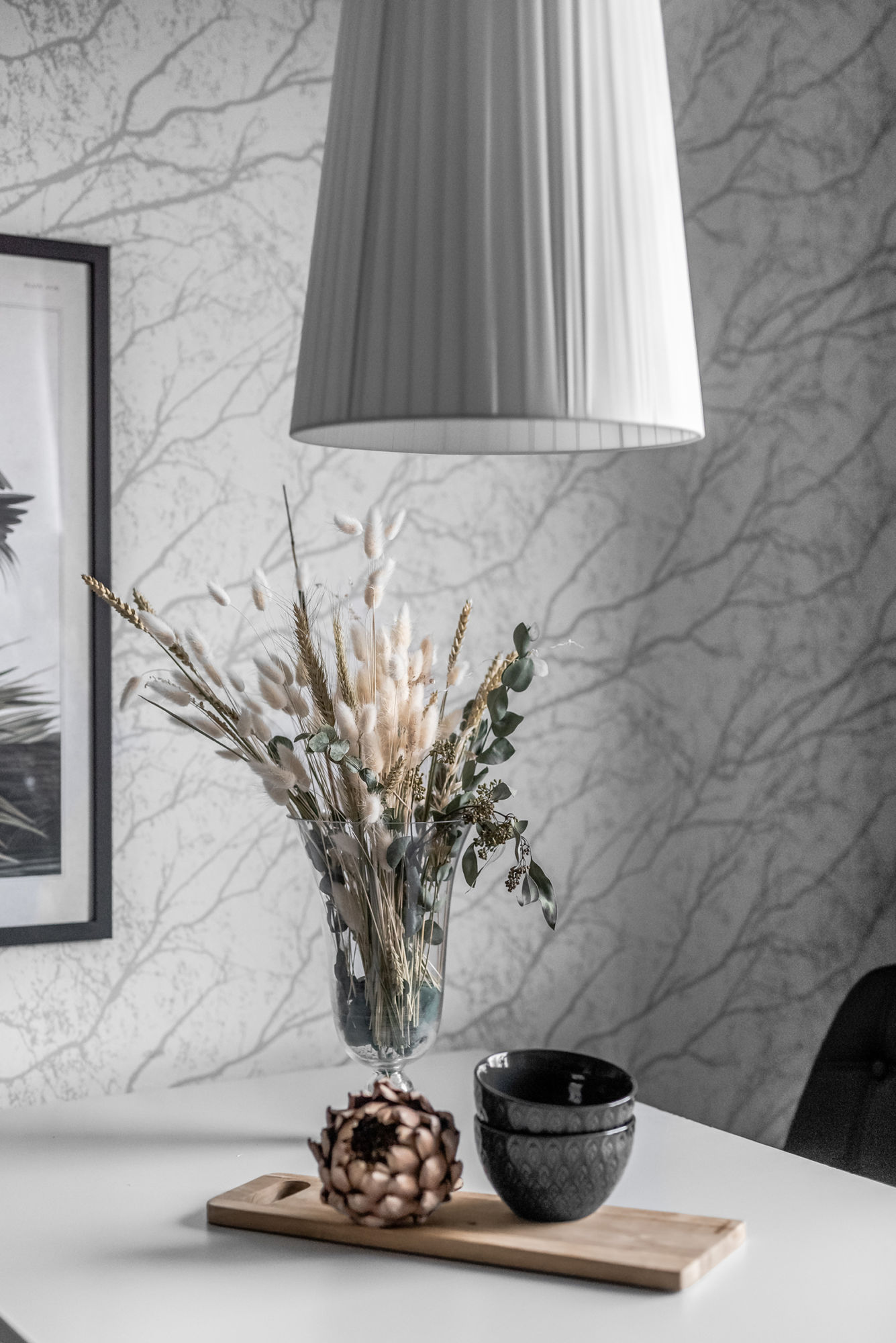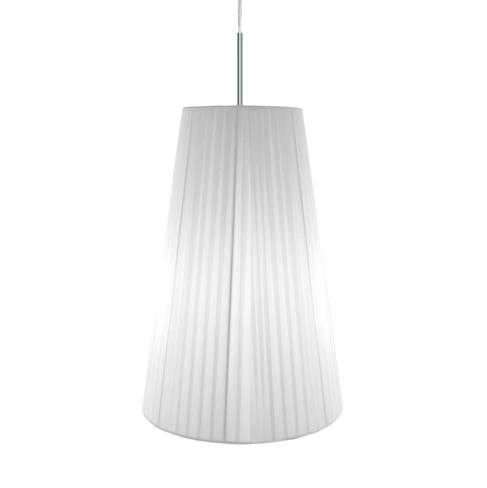 Taklampa gjord av vita plastband virade runt metallstomme. Kromad metall kachering med rör och transparent sladd.