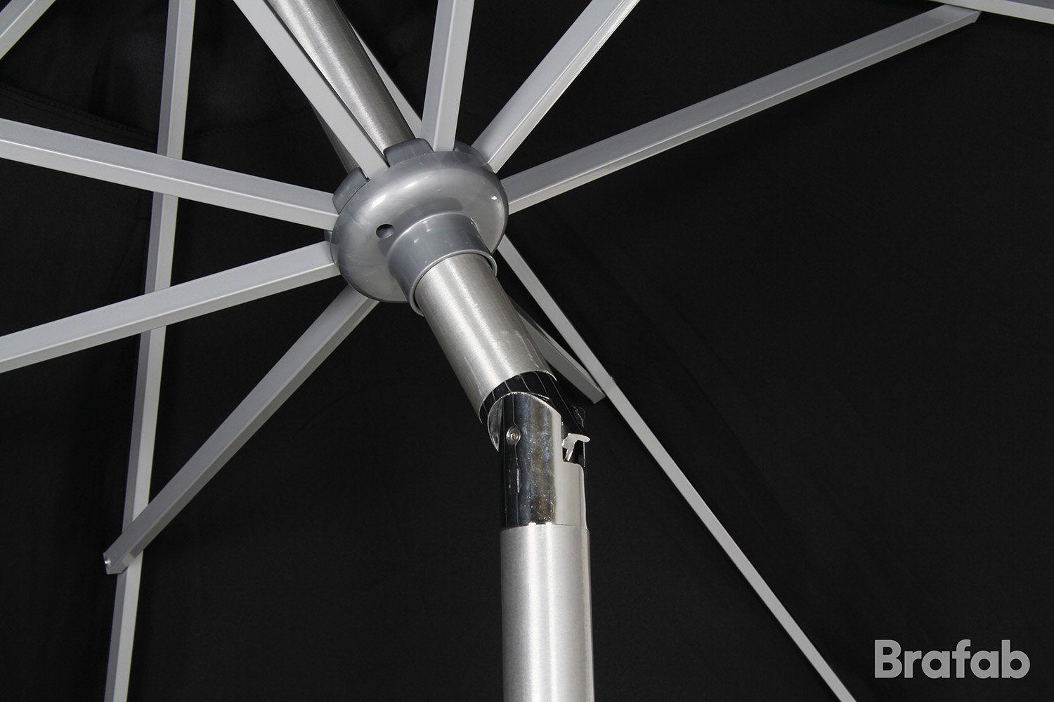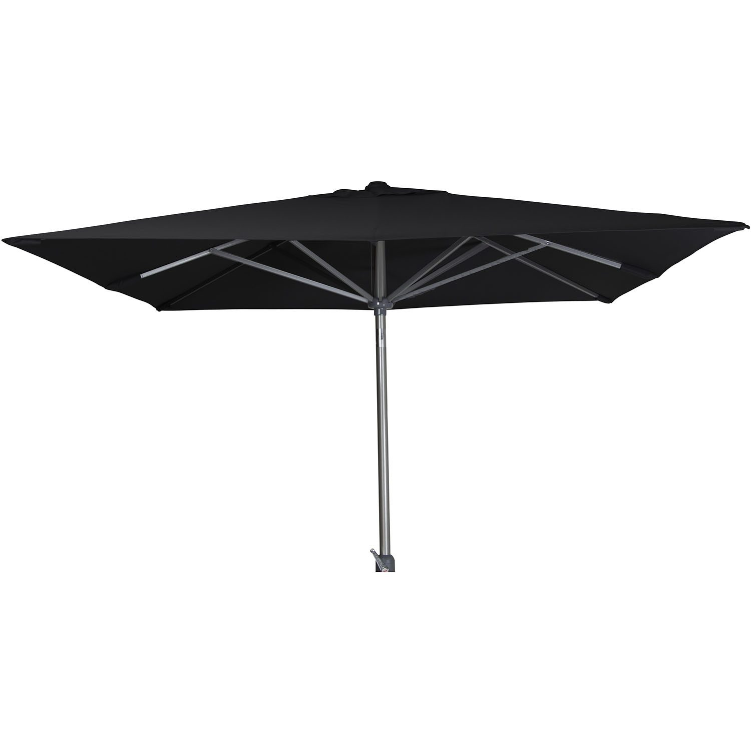 Parasoll med aluminium stång, tvådelad för enklare transport. Stången har även en vev och tilt funktion som gör att man kan vinkla parasollet. Duken är fyrkantig 250x250 cm i 210 gr olefinväv med ventilationslucka.