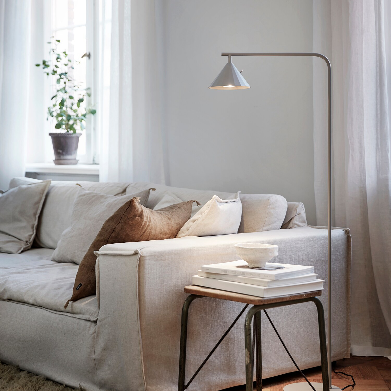 Stilfull golvlampa från CO Bankeryd. Tillverkad i metall med en matt grå/beige finish som ger lampan en modern och stilren känsla. En läckert böjd lampfot och en konisk lampskärm med brytare på skärmen, svart sladd i PVC.