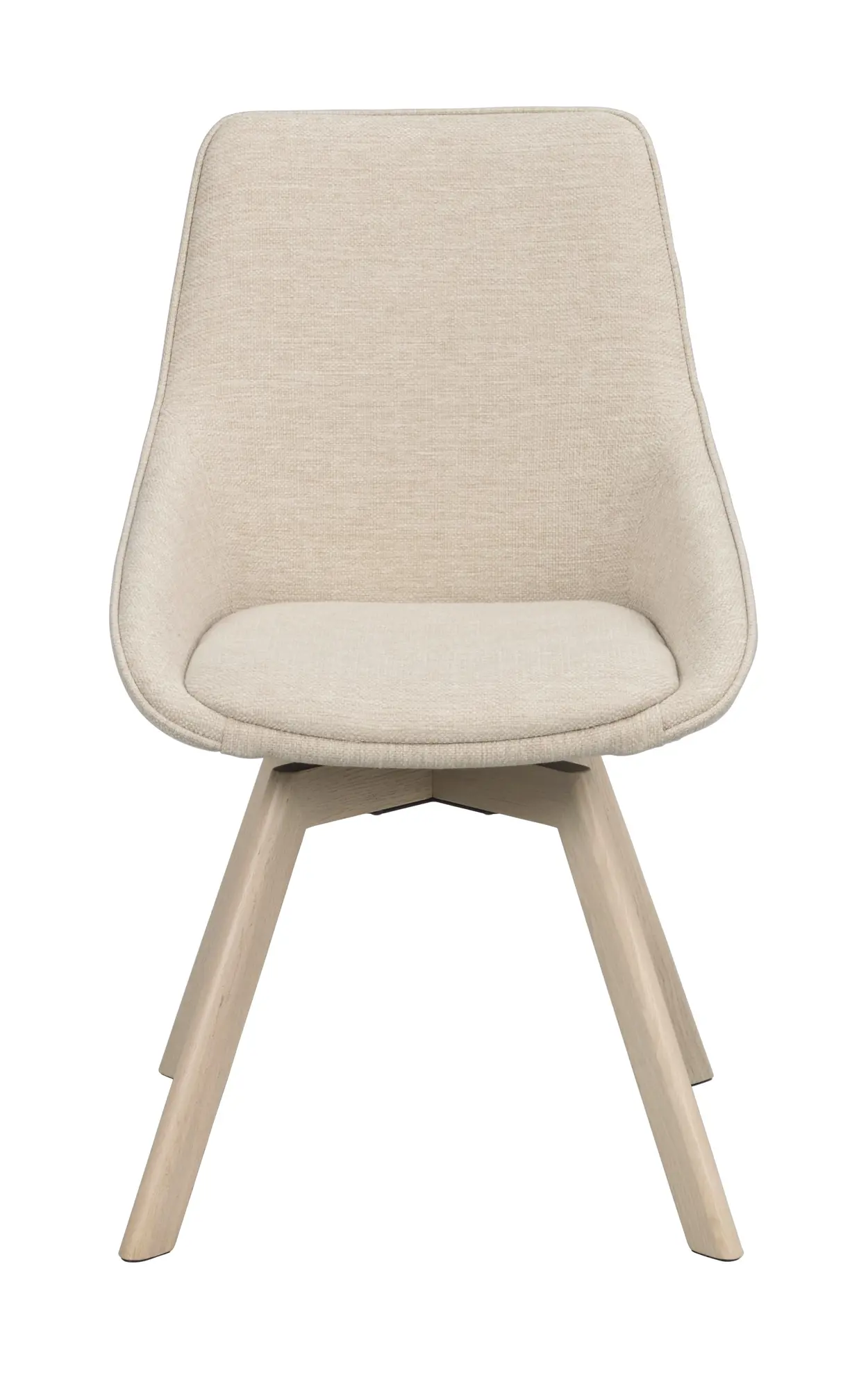 Populära Alison stol med träunderrede och snurrfunktion. Här syns den i ett tåligt ljusbeige tyg och med ben i vitpigmenterad ek. Alison har en stoppad sits med hög sittkomfort i kupad design och ben med snurrfunktion i 360 grader. Stolen passar perfekt runt matbordet men även som udda stol till skrivbordet. Alison är FSC®-certifierad och finns även i andra jordnära färger.