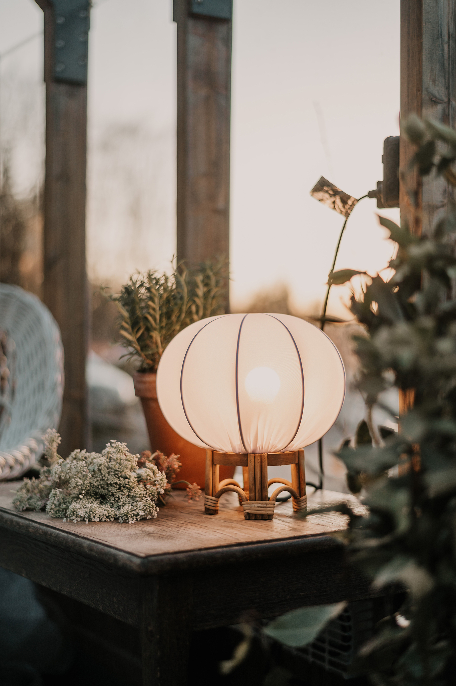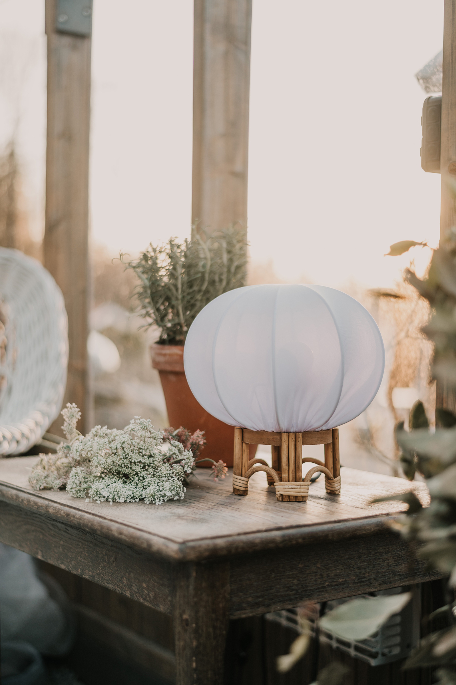 Lampfoten är tillverkad av naturfärgad rotting och levereras färdigmonterad med en vit lampskärm gjord av vitt stretchtyg. Tyget är vattenavvisande vilket gör att lampan kan användas utomhus när den kompletteras med lämplig kabel. Det går därför att uppnå IP44-klassificering så länge kabeln som används är av denna standard. Notera att kabel ej medföljer denna artikel, det behöver kompletteras.