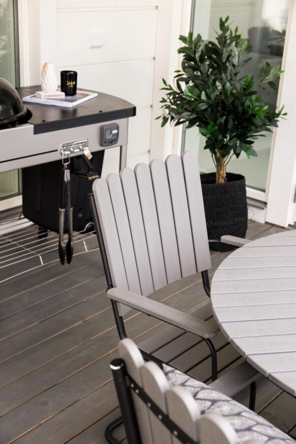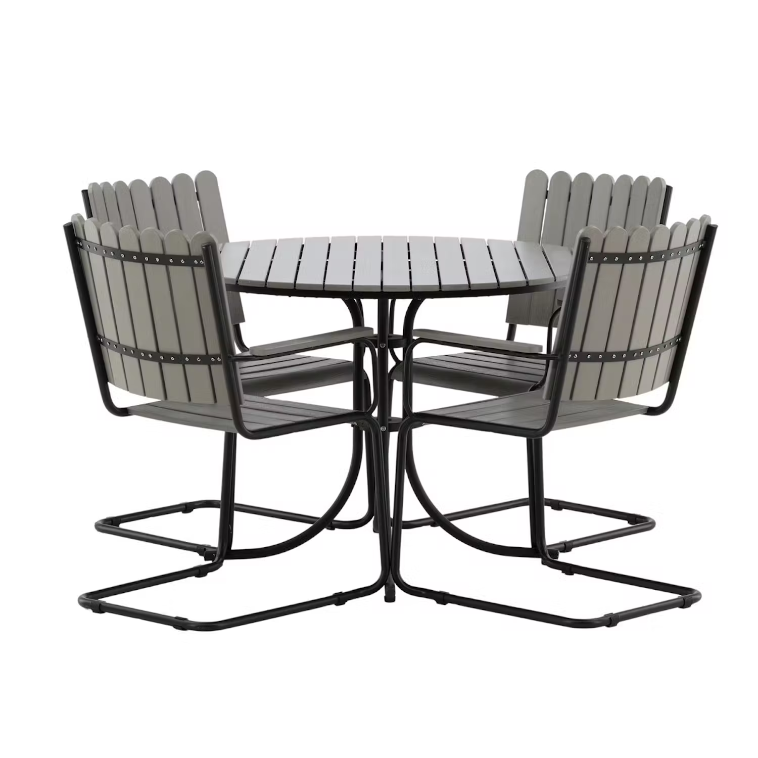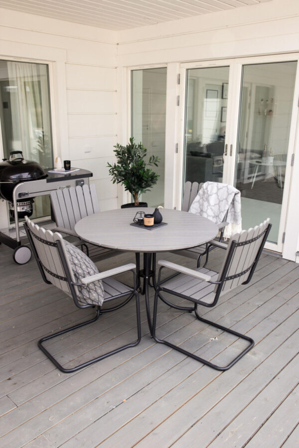 Holmsund är en klassisk utegrupp med runt bord och fyra karmstolar. Detta runda matbord är ett sant blickfång med sin charmiga design och kommer garanterat att få dig att känna dig hemtrevligt och stolt över din uteplats. Tillverkad av slitstarkt svart stål och med stolar och bordskiva i härligt grå aintwood, är Holmsund matgrupp redo att möta alla utmaningar vädret har att erbjuda.