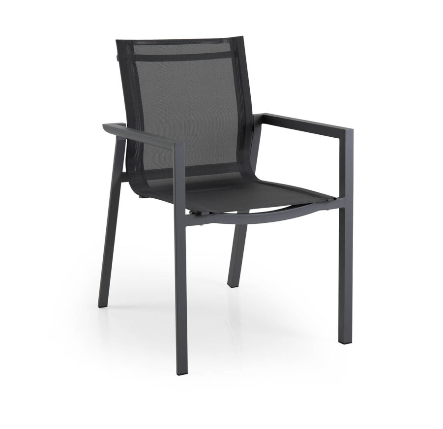 Karmstol Delia, en modern, lättplacerad stol med arm. I mattlackerad aluminium med sits i grå textilene. Stolen är stapelbar och därmed smidig att förvara. Från Brafab.