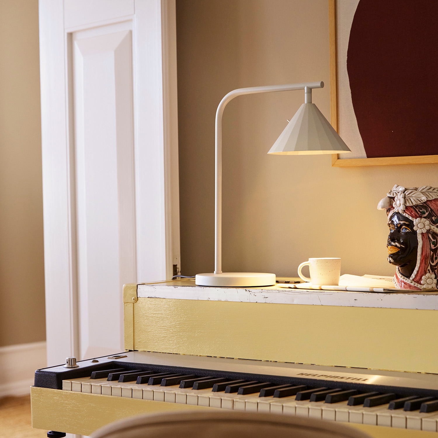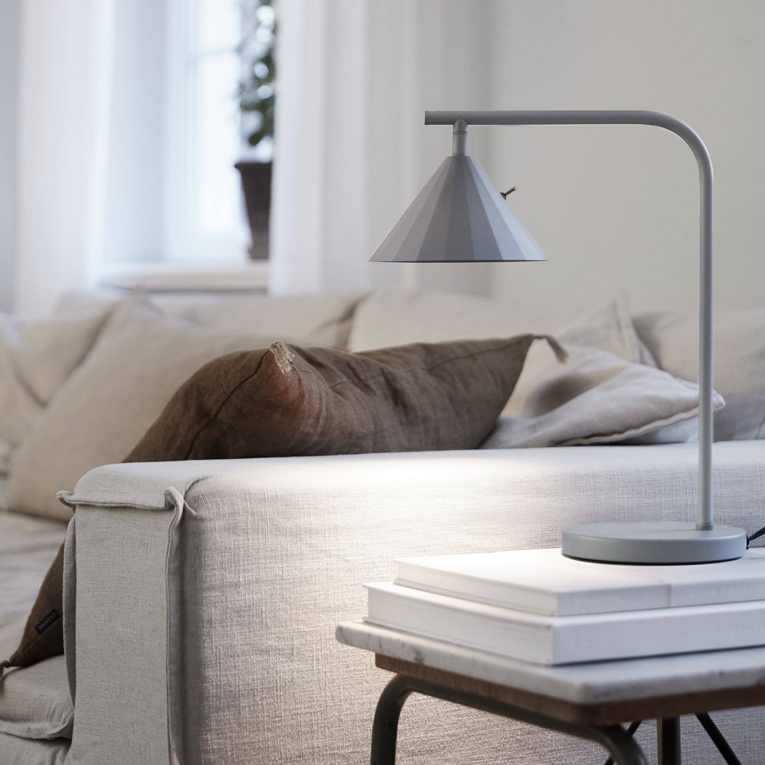 Stilfull bordlampa från CO Bankeryd. Tillverkad i metall med en matt grå/beige finish som ger lampan en modern och stilren känsla. En läckert böjd lampfot och en konisk lampskärm med brytare på skärmen, svart sladd i PVC.