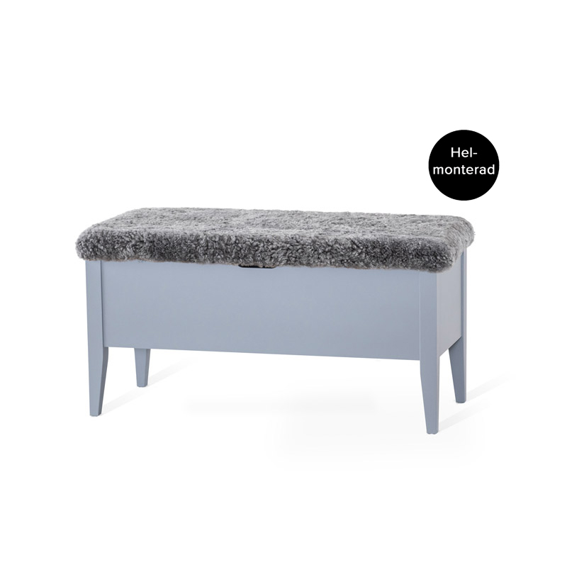 Välj mellan olika klädslar på toppen – grå fårskinnsimitation, äkta fårskinn, ljusgråa tyget Chelsea eller bruna tyget Abriamo. På insidan av bänken finns ett rymligt fack med en praktisk skiljevägg, som även går att tas bort för att göra plats för större föremål.