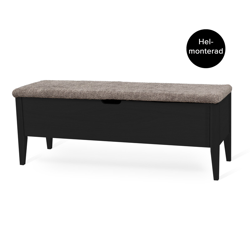 Välj mellan olika klädslar på toppen – grå fårskinnsimitation, äkta fårskinn, ljusgråa tyget Chelsea eller bruna tyget Abriamo. På insidan av bänken finns ett rymligt fack med en praktisk skiljevägg, som även går att tas bort för att göra plats för större föremål.