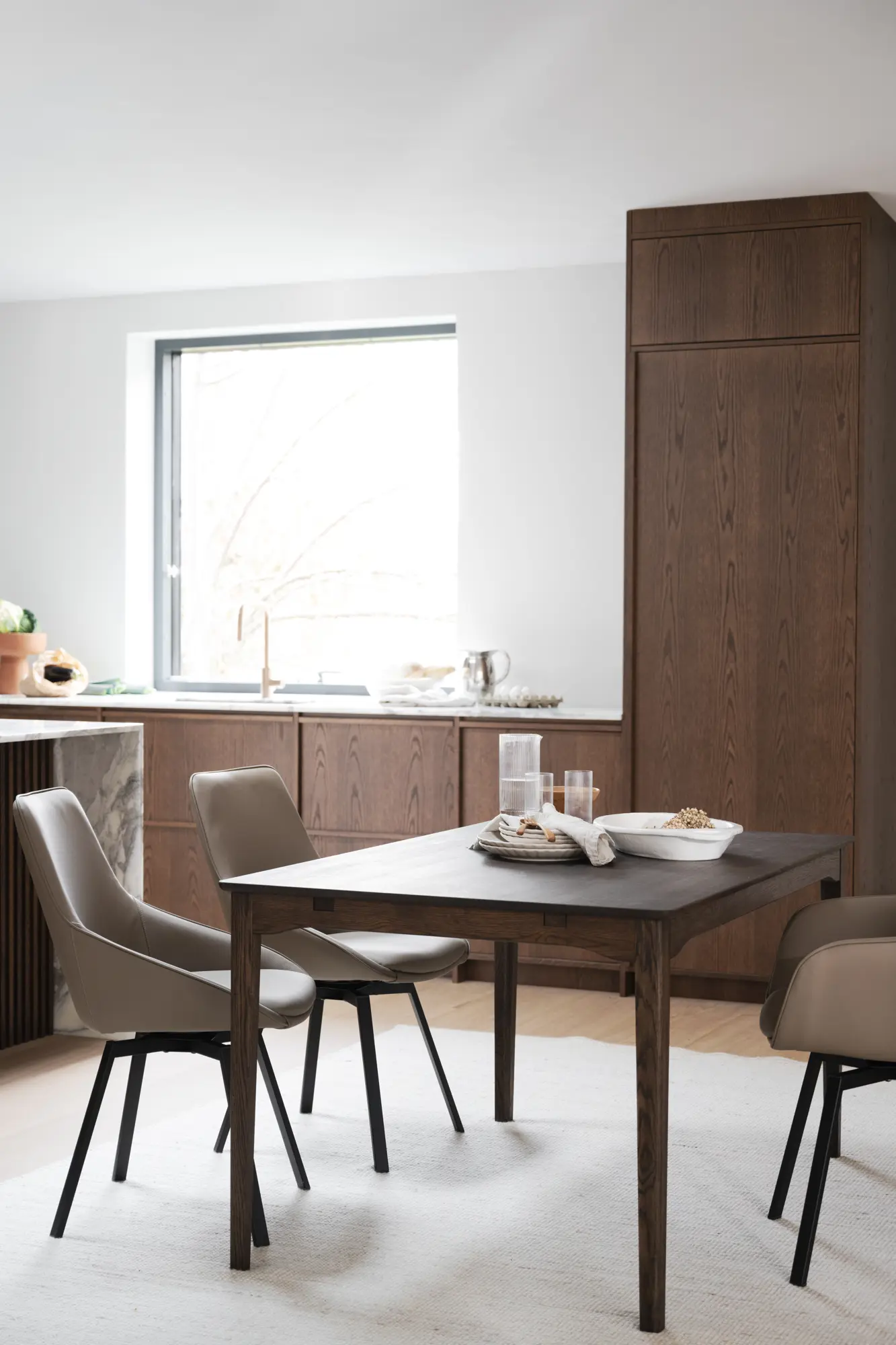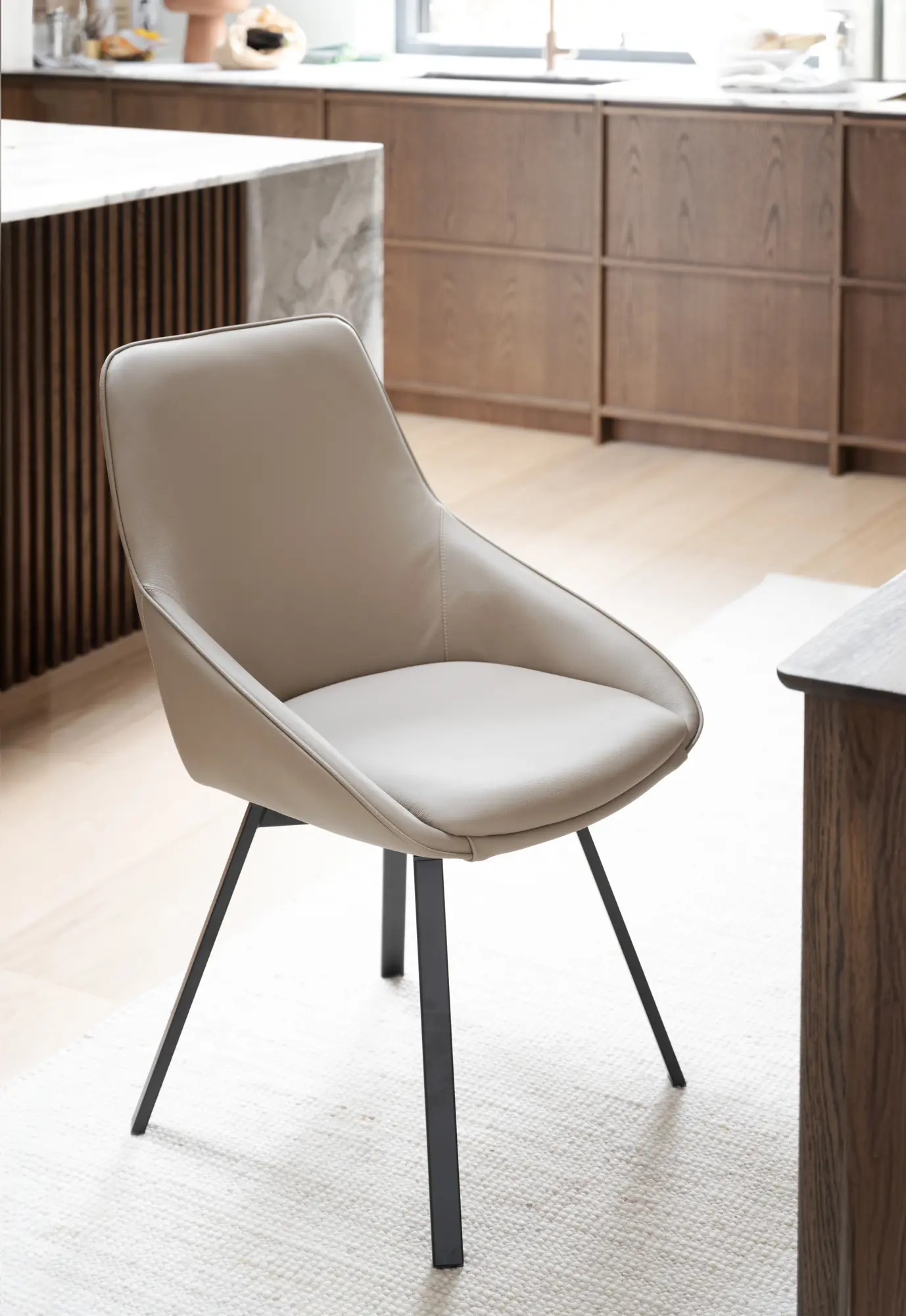 Populära Alison stol med metallunderrede och snurrfunktion. Här i beige läder och med ben i svart metall. Alison har en stoppad sits med hög sittkomfort i kupad design och ben med snurrfunktion i 360 grader. Stolen passar perfekt runt matbordet men även som udda stol till skrivbordet. Alison är FSC®-certifierad och finns i fler färger och med träunderrede. Säljs endast i 2-pack. Sits i plywood med polyeterskum stoppning, äkta läder, ben i pulverlackad metall med snurrfunktion.