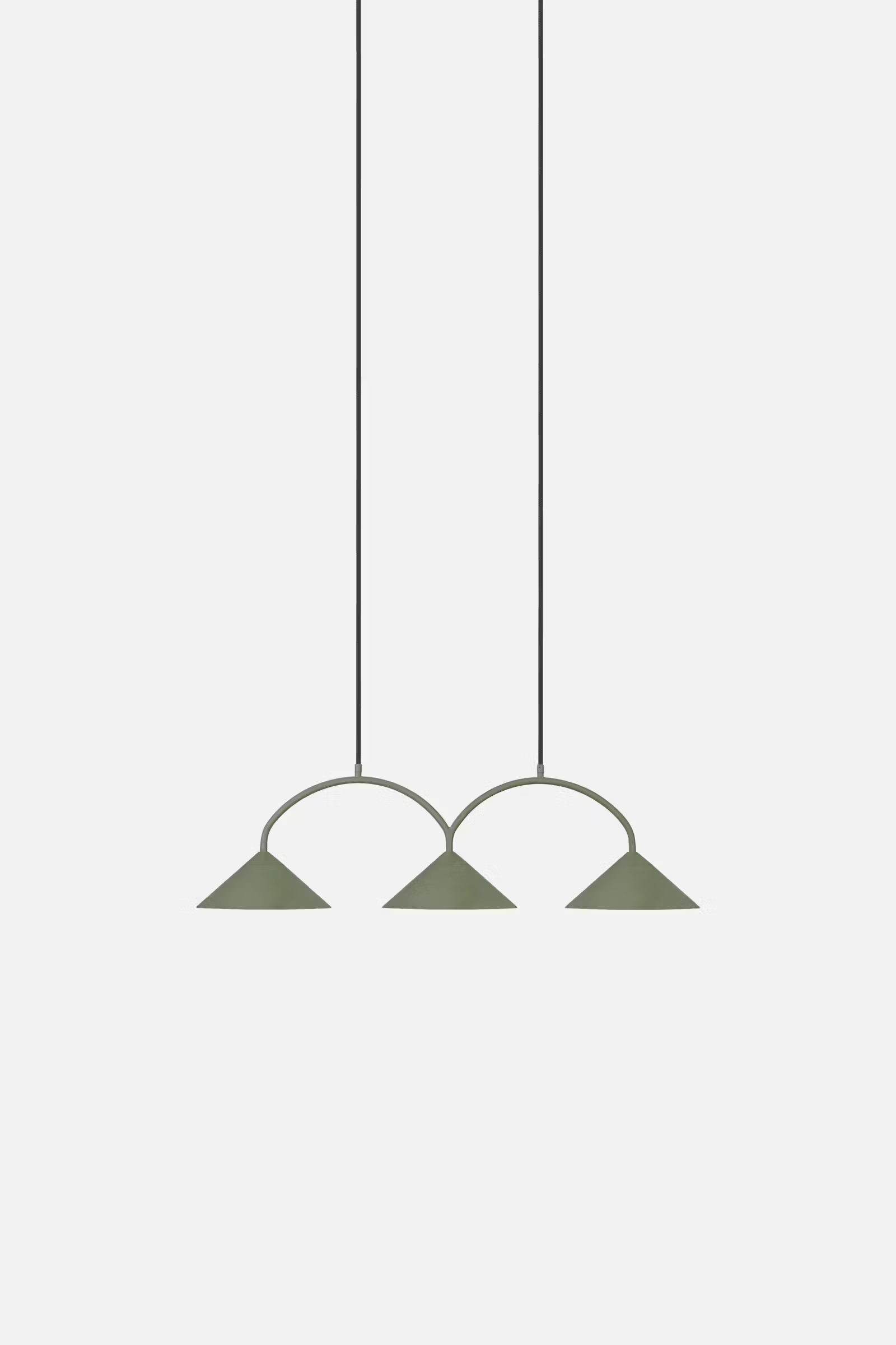 Curve 3 är resultatet av en lek med geometriska former där de mjuka rundade bågarna möter de skarpa triangulära linjerna på skärmarna. Denna lampa passar utmärkt att hänga över matsalsbordet såväl som ovanför köksön. Denna lampa är tillverkad av mattlackerad metall med tre stycken metallskärmar samt två stycken 200 cm långa svarta textilkablar med en matchande takkopp i metall. Kronkoppling för takanslutning medföljer ej.