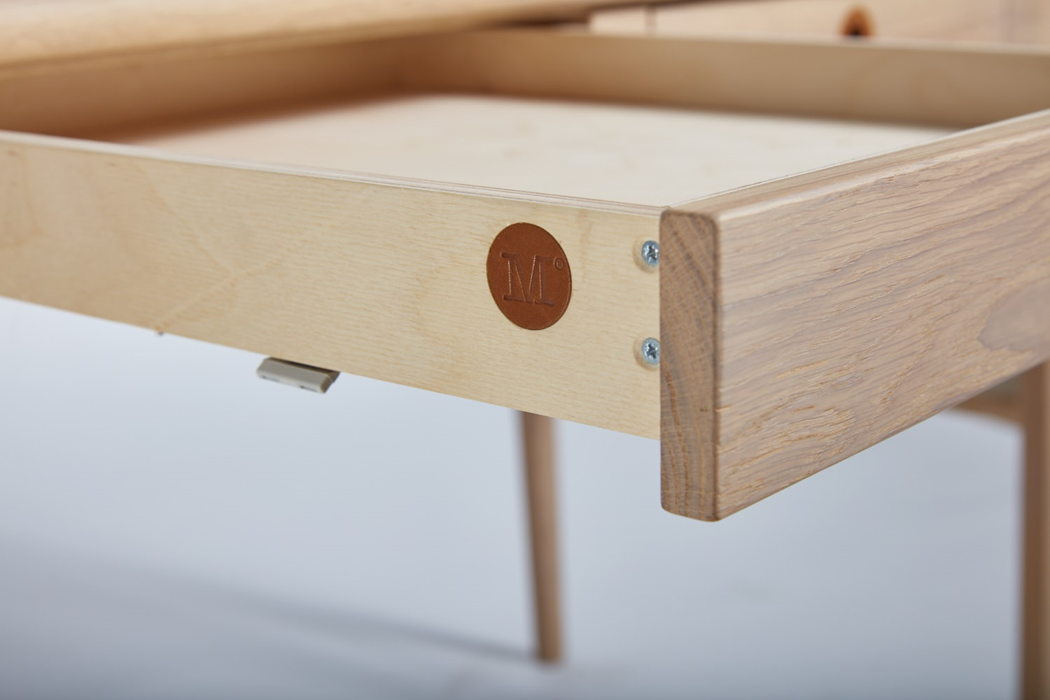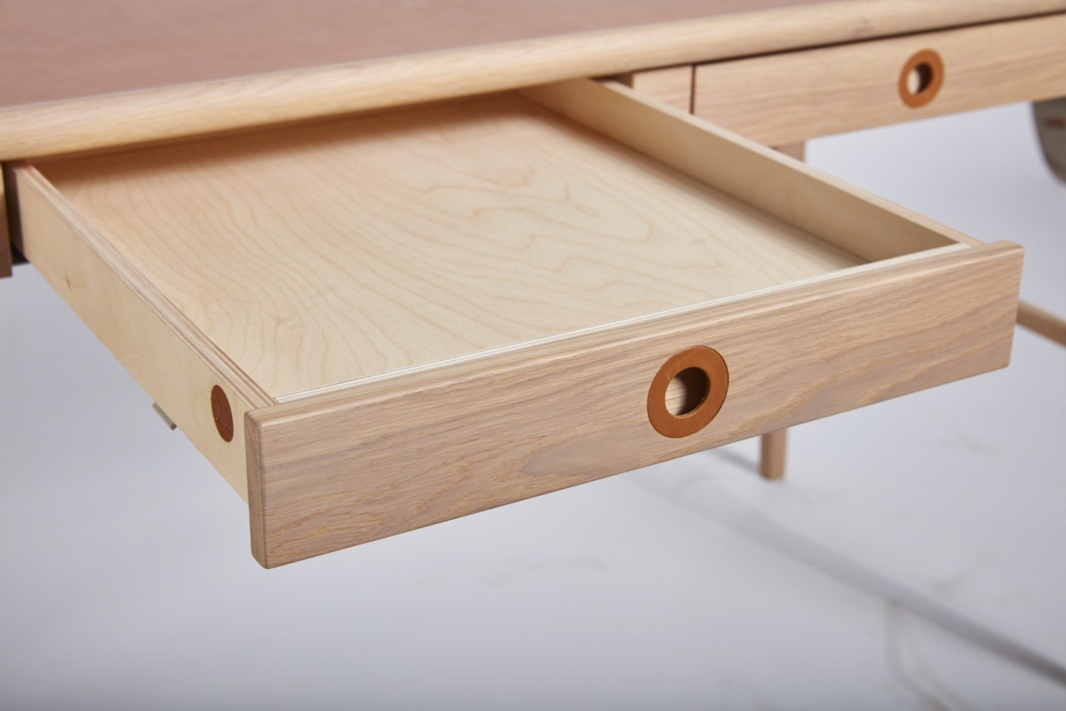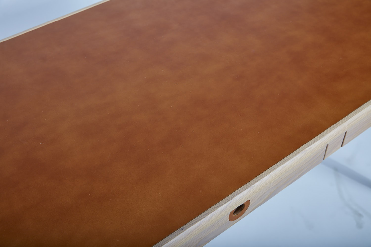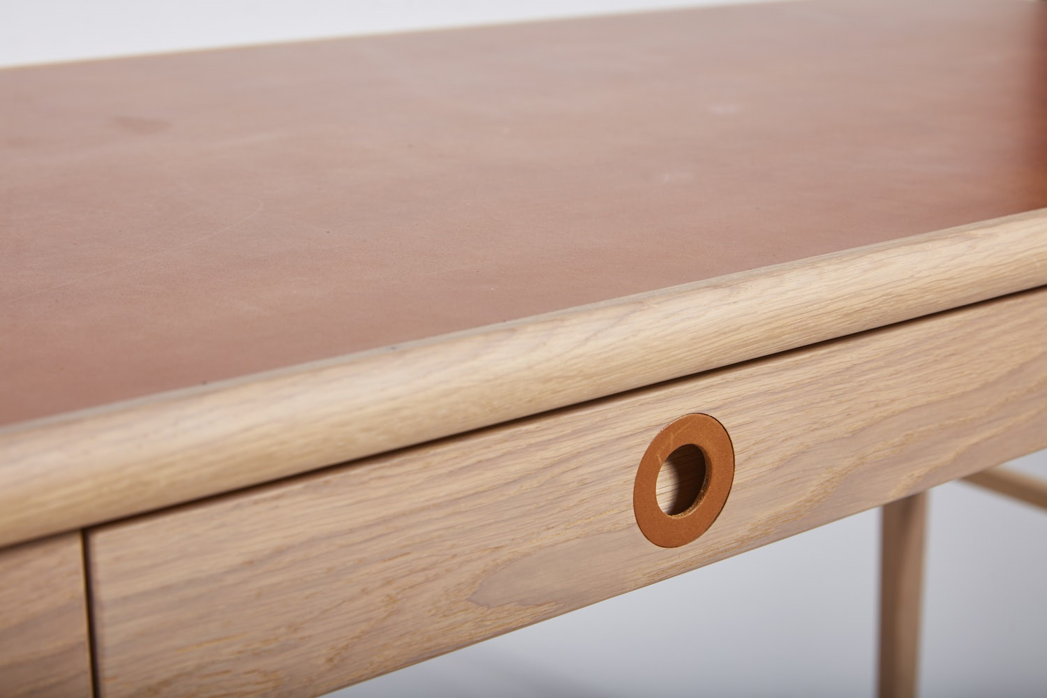 Övrig info : Handtag av läder. Lådor i plywood med underliggande mjukstängande skena. Skrivbordstopp i återbrukat läder.