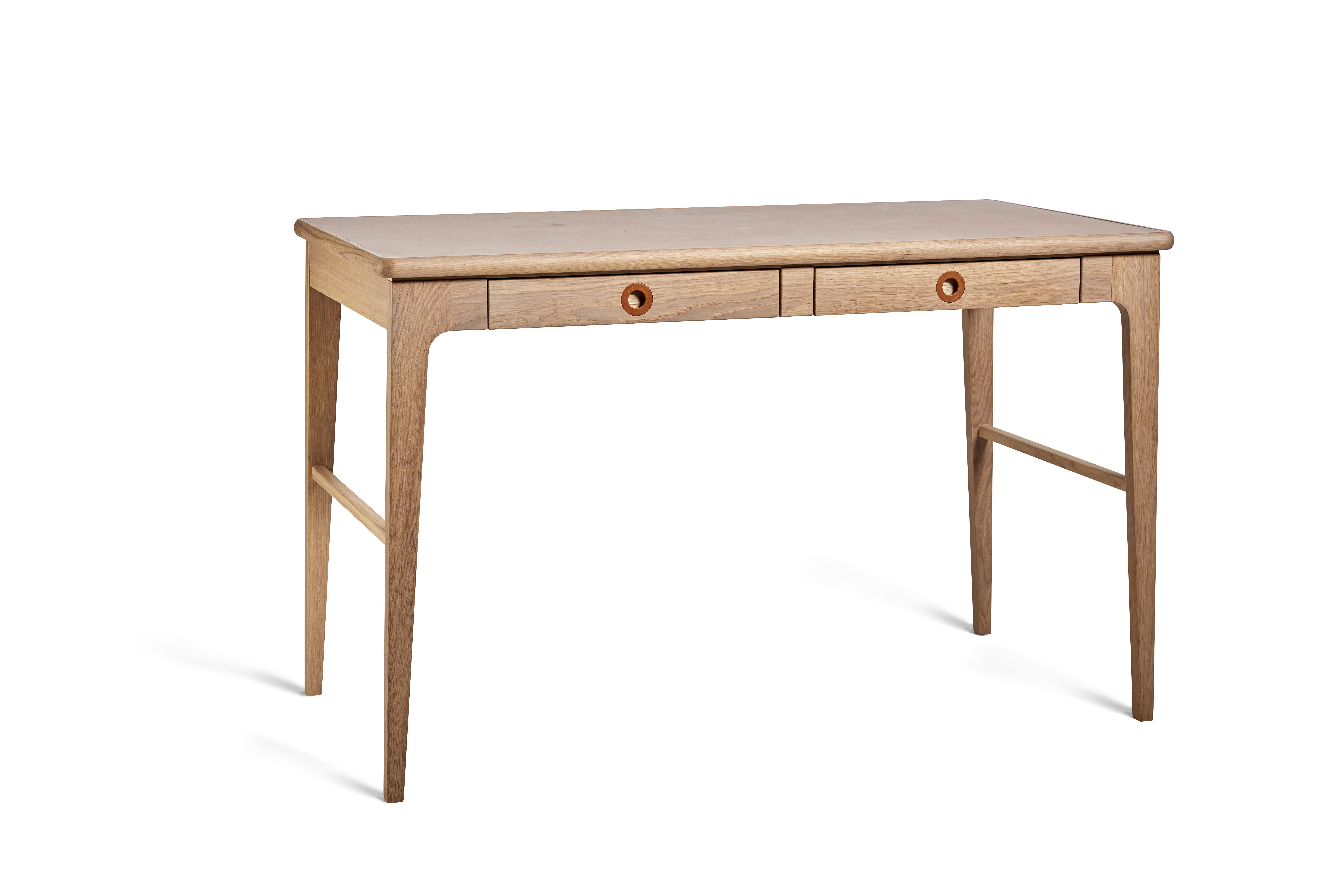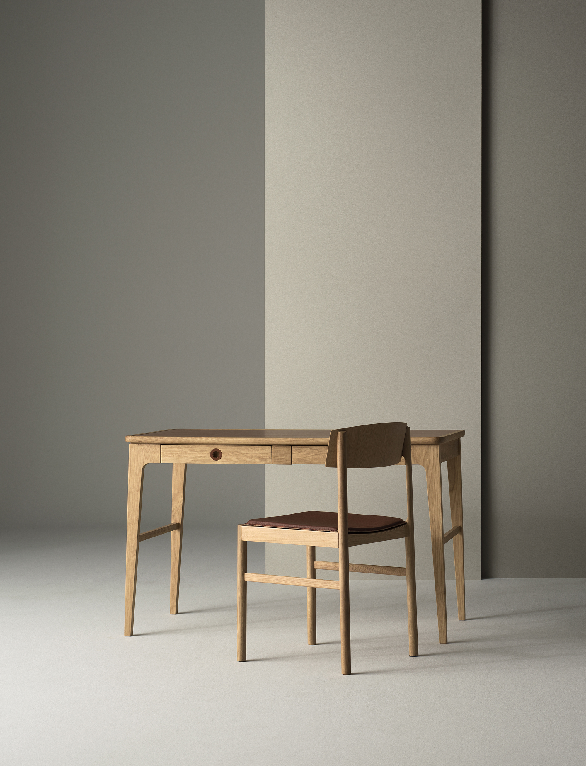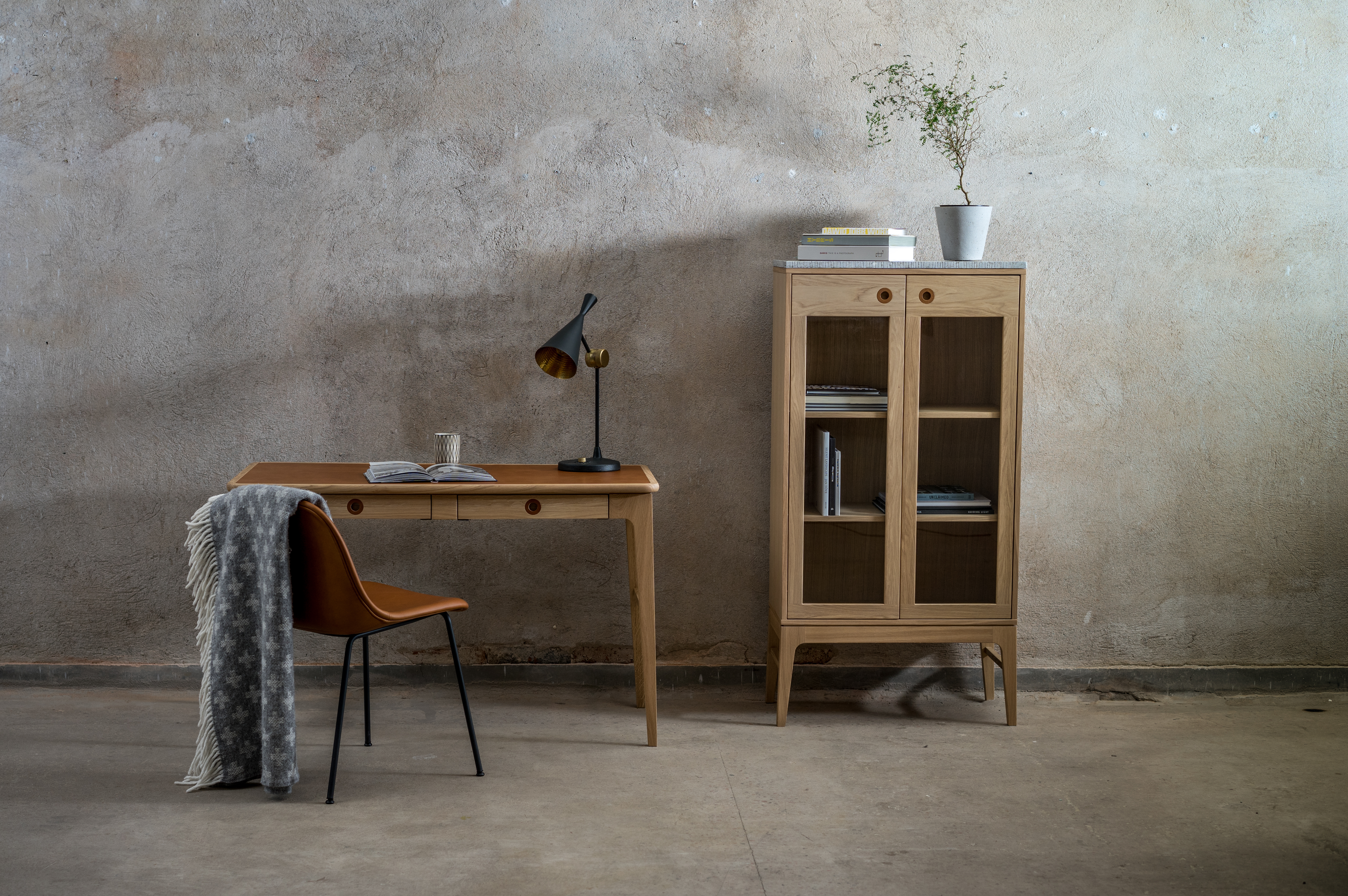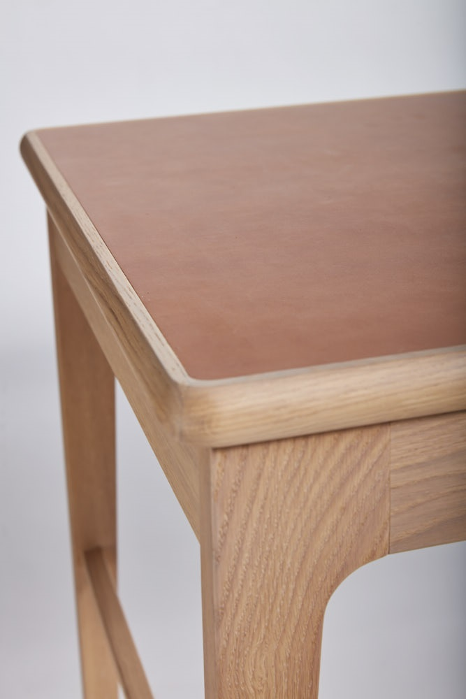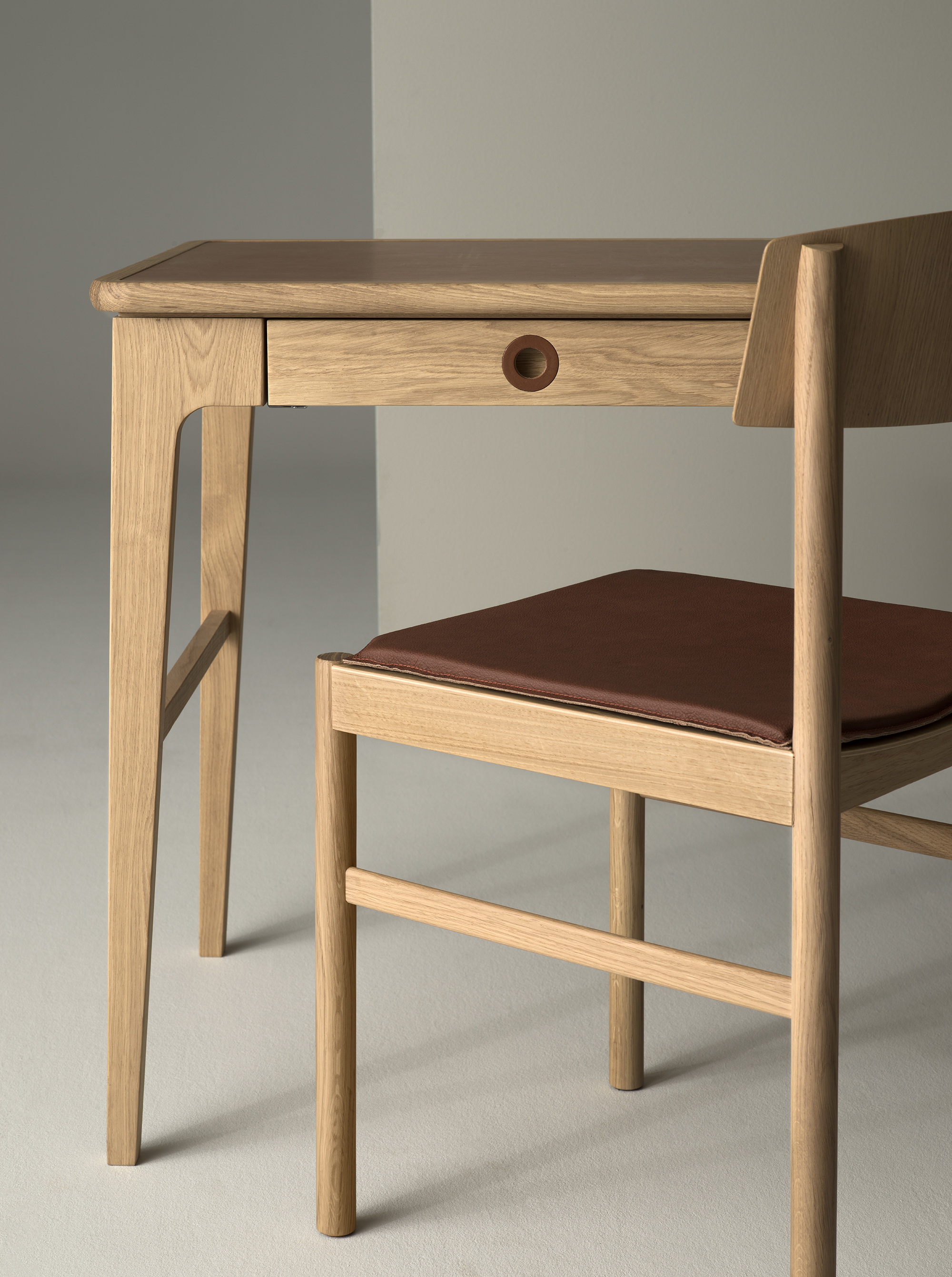 Övrig info : Handtag av läder. Lådor i plywood med underliggande mjukstängande skena. Skrivbordstopp i återbrukat läder.