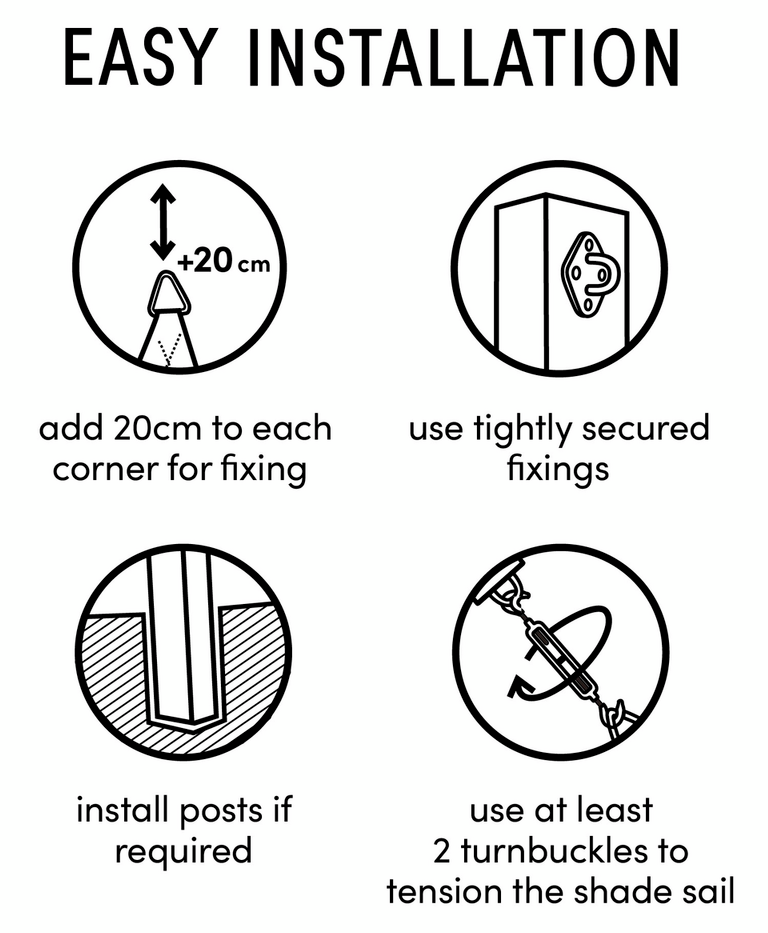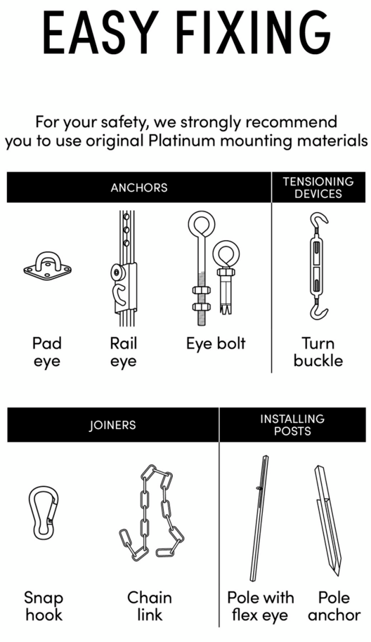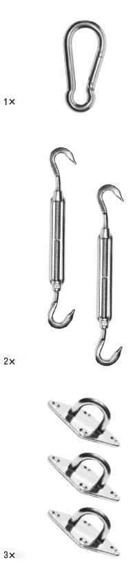 En komplett Platinum Sun & Shade monteringssats för enkel montering av ett triangulärt skuggsegel. Innan du monterar solseglet är det viktigt att först bestämma exakt var seglet ska placeras. Sedan monterar du öglorna på rätt plats på väggen eller stolpen. Genom att använda karbinhaken och vantskruven kan du hänga seglet tätt och det sitter fast ordentligt. Platinum Sun & Shade monteringsmaterial är tillverkade av högkvalitativt nautiskt rostfritt stål 316.