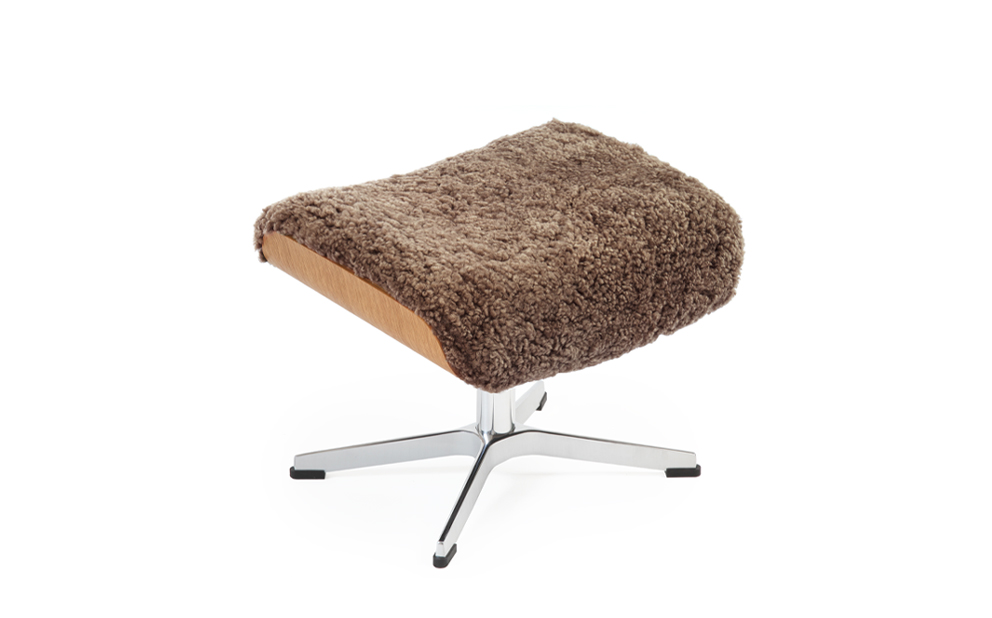 Fotpall som passar till fåtöljen Air. Här klädd i fårskinn Sahara med balja i ekfanér och X-fot i formgjuten aluminium.