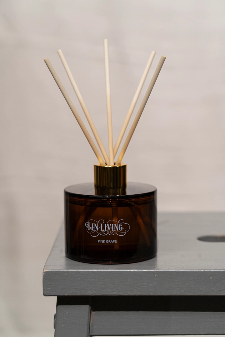 Doftpinnar i en stilren och klassisk glasflaska i apothécaglas i brun färg. Dessa doftpinnar har doften av Pink Grape som är en uppiggande, något söt och alldeles fantastiskt härlig doft att ha i hemmets alla rum.