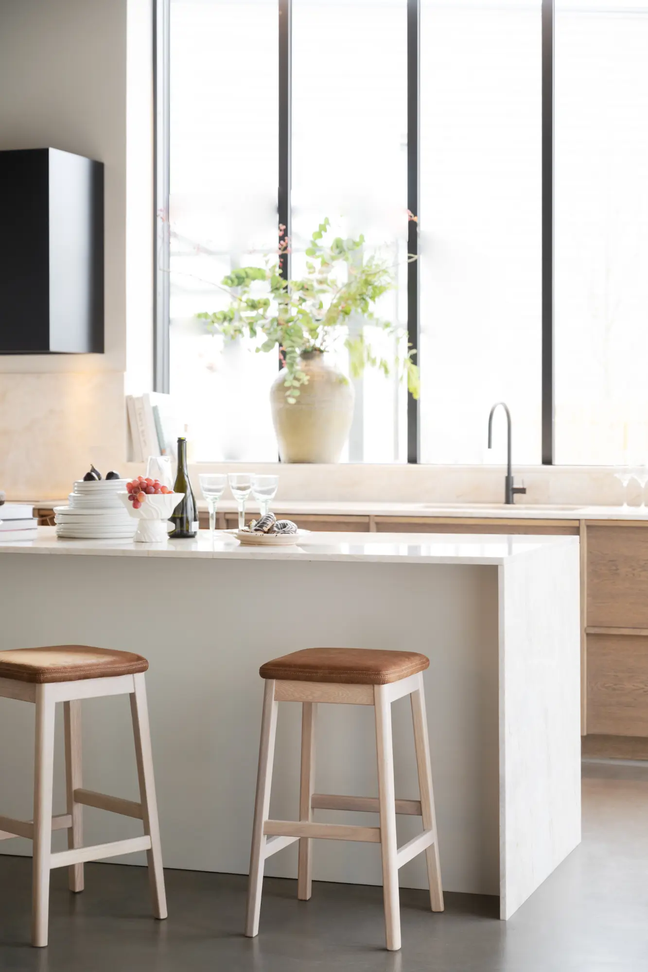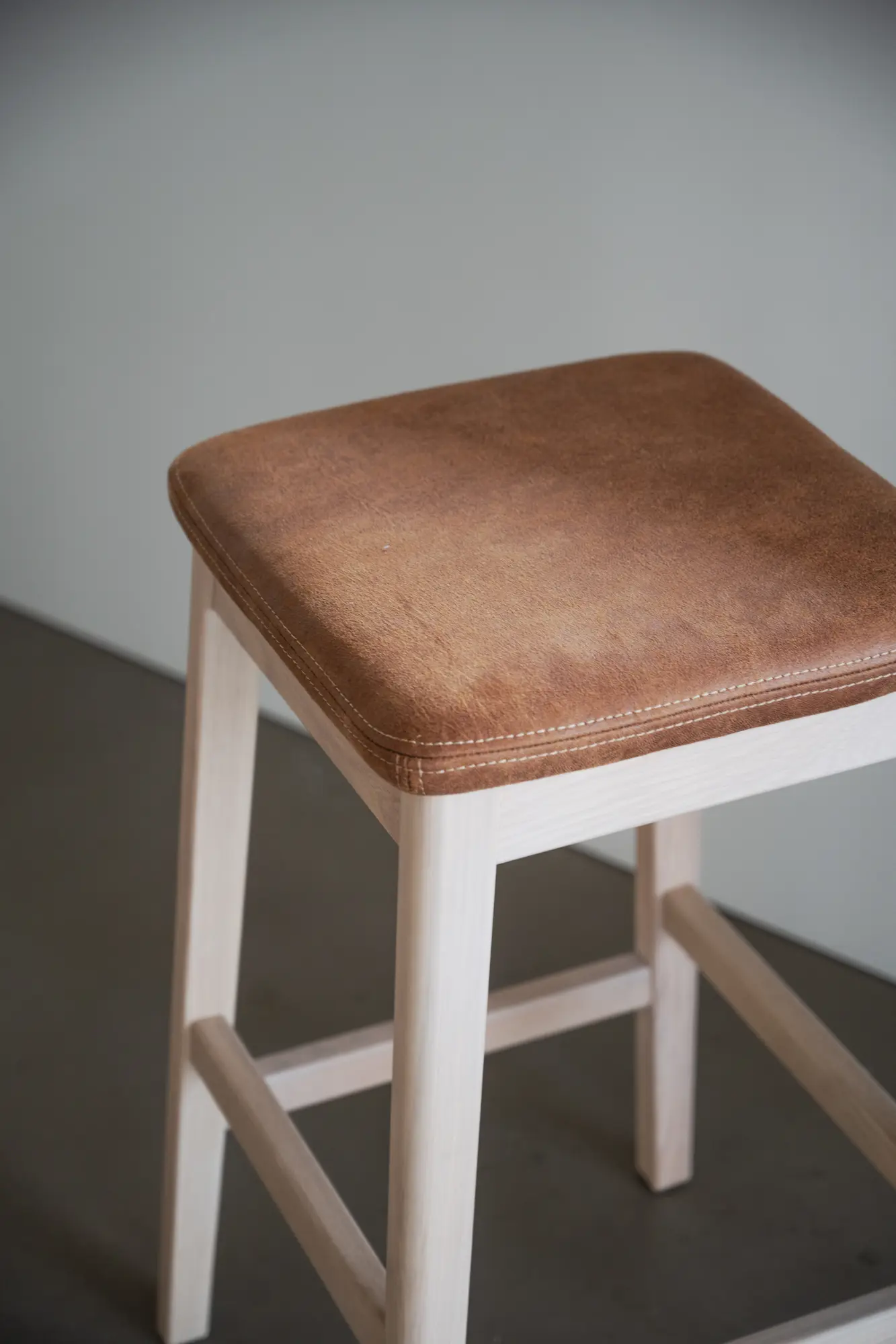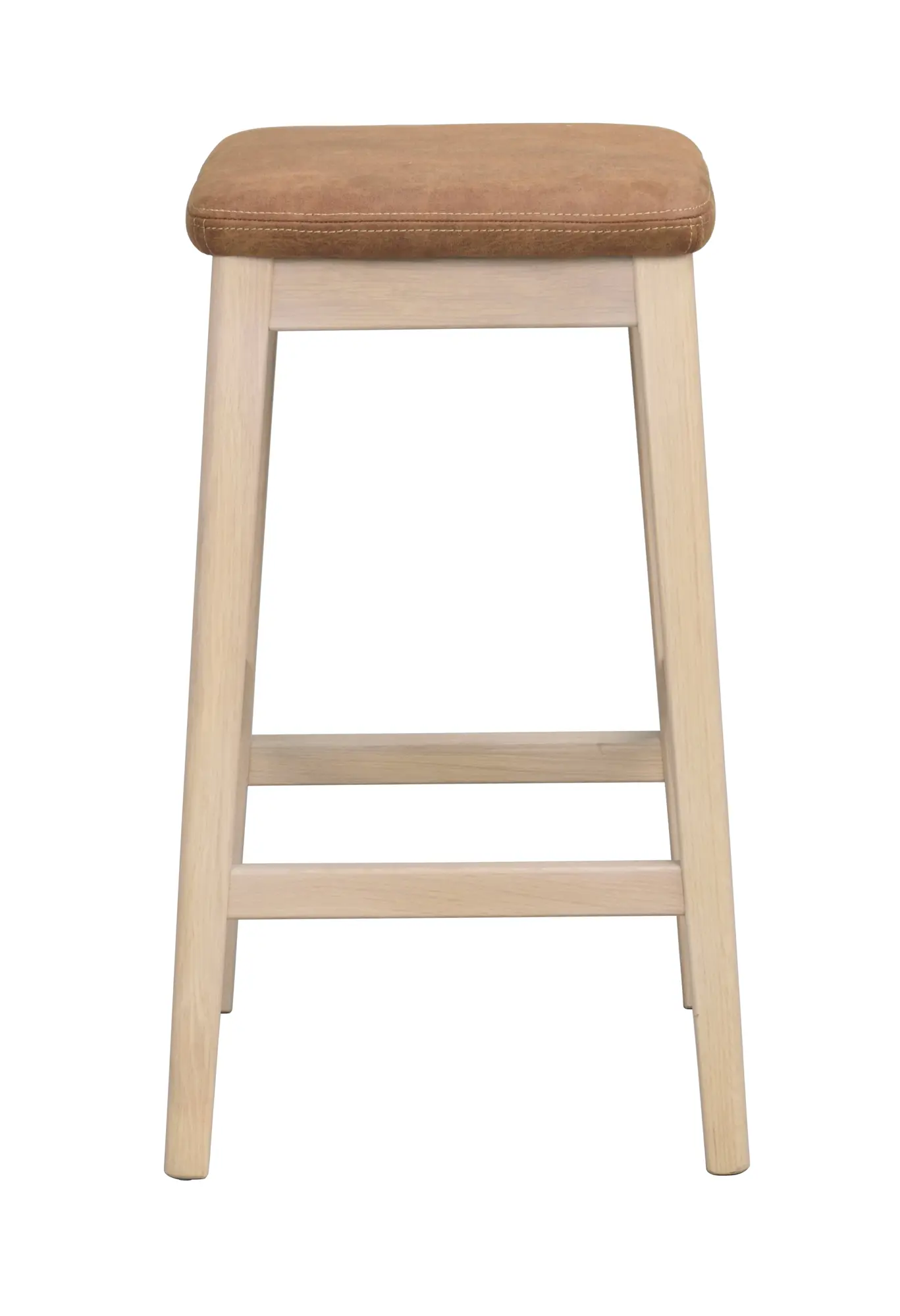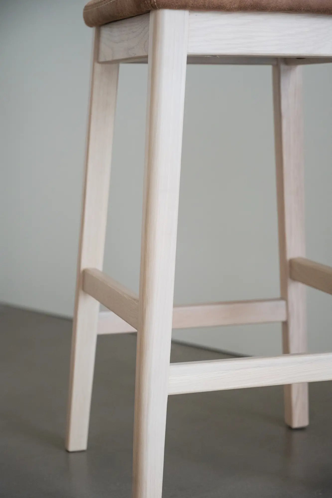 Livermore barpall kombinerar stilren design med komfort. Med sina raka linjer i massiv, FSC®-certifierad, vitpigmenterad ek och en elegant stoppad sits i slitstarkt lädertextil är den både modern och tidlös. Perfekt för köksön eller barbordet.