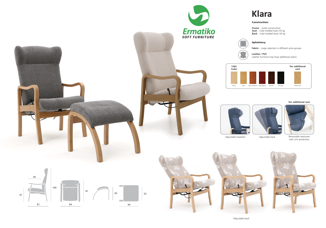 Går att beställa i flera olika färger i tyg eller läder. Man kan även välja färg på träet på stommen. Kombinera gärna med matchande fotpall.