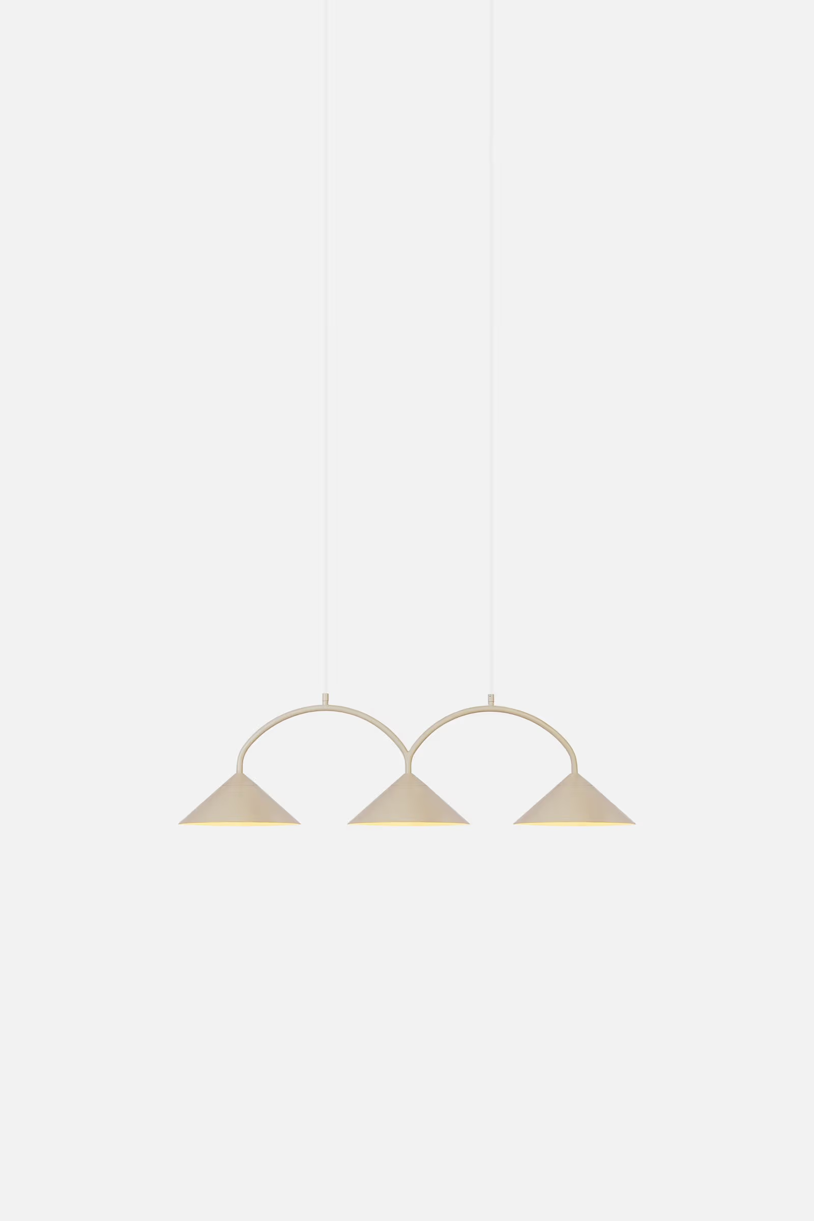 Curve 3 är resultatet av en lek med geometriska former där de mjuka rundade bågarna möter de skarpa triangulära linjerna på skärmarna. Denna lampa passar utmärkt att hänga över matsalsbordet såväl som ovanför köksön. Denna lampa är tillverkad av mattlackerad beige metall med tre stycken metallskärmar samt två stycken 200 cm långa vita textilkablar med en matchande takkopp i metall. Kronkoppling för takanslutning medföljer ej.
