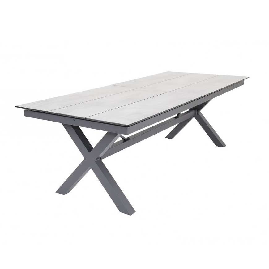 Bordet X-leg är ett både praktiskt och snyggt utebord. Toppskiva i tålig laminat med en snygg dark grey look och underrede med kryssben i lackad aluminium. Bordet har också en praktisk iläggsskiva som förvaras i bordet då den inte används – perfekt när det väntas gäster.