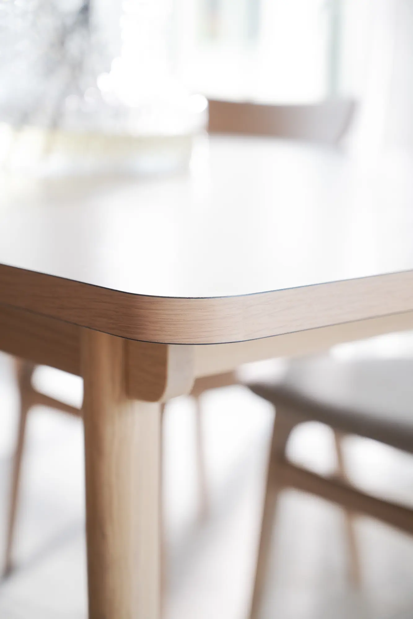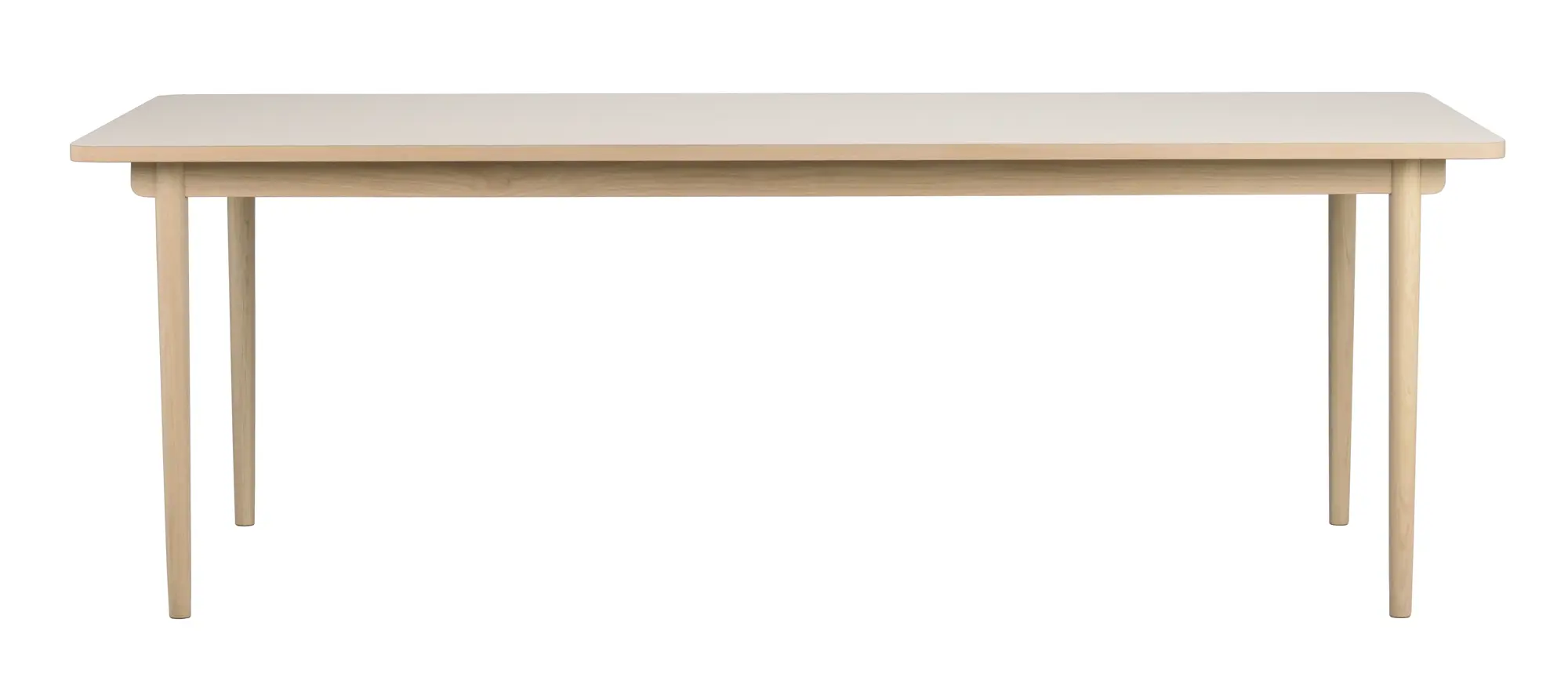 Fairmount är ett elegant matbord i vitpigmenterad ek med en nätt och luftig design. Bordsskivan är i slitstarkt högtryckslaminat, vilket gör den reptålig och motståndskraftig mot väta – perfekt för både livet i vardagen och festliga tillställningar. Den beige kulören på bordsskivan tillsammans med träkantlist i faner och de massiva ekbenen gör att matbordet passar in i de flesta hem. En hantverksmässig detalj under bordet är att sargen löper förbi benen i en mjukt formad design, en genomarbetad lösning som ger bordet ett unikt och stilrent uttryck.