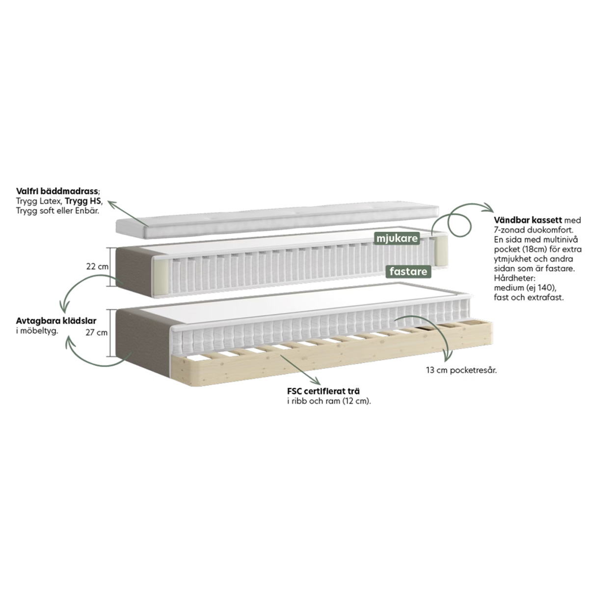 - Avtagbar klädsel på underbäddar vilket ger möjlighet till två olika utseende - delad (klassisk) eller seamless underbädd (160, 180 och 210 cm bredd).