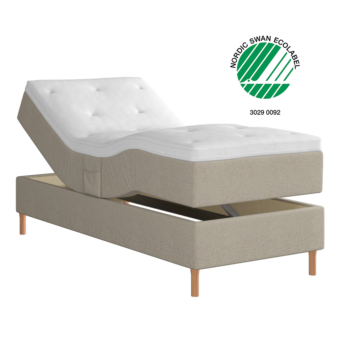 Pris avser Skogslind ställbarsäng 105x200 cm i tyg Hevre, exkl bäddmadrass och gavel, inkl ben Elegance eller Colin.