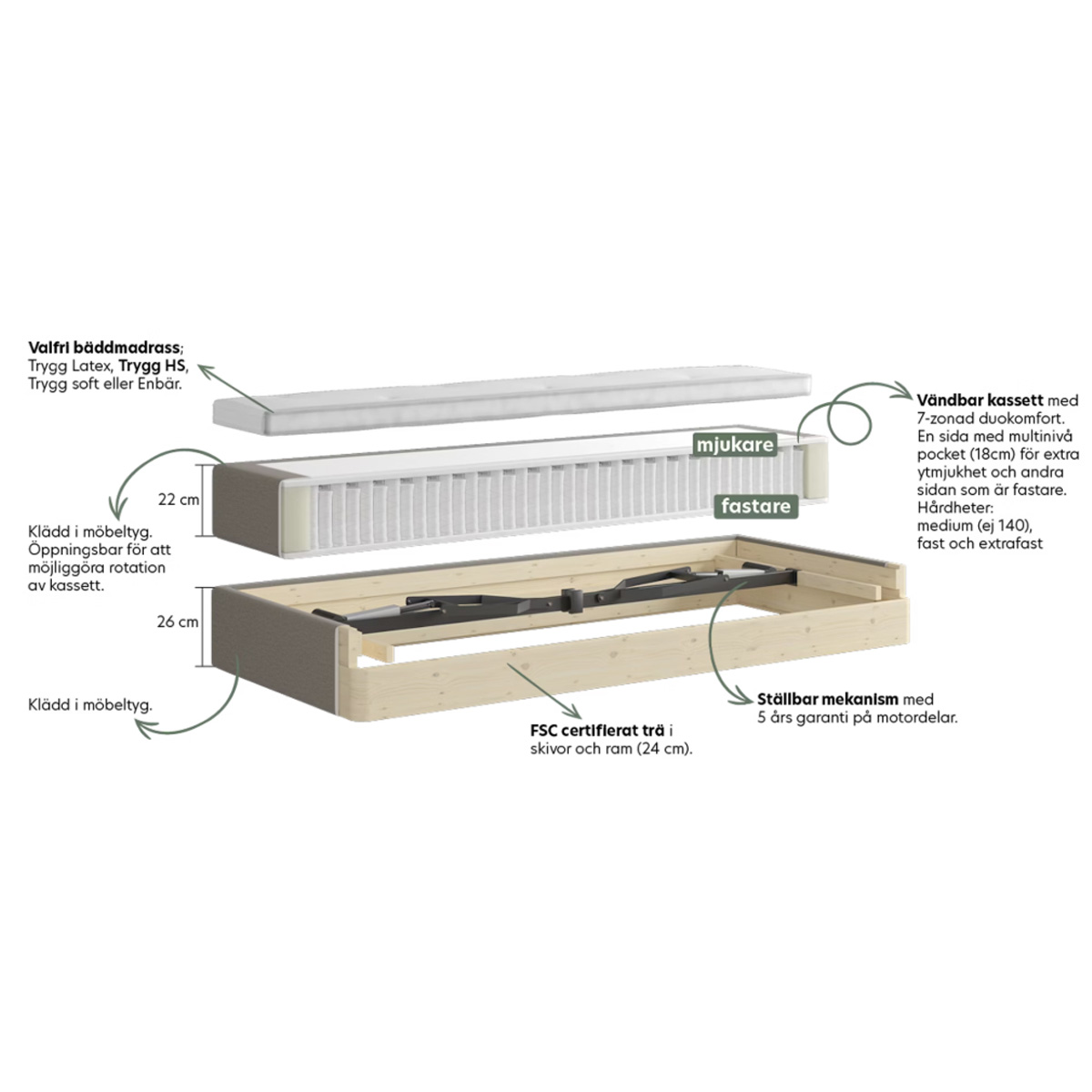 Välj mellan medium, fast och extra fast liggkomfort.
