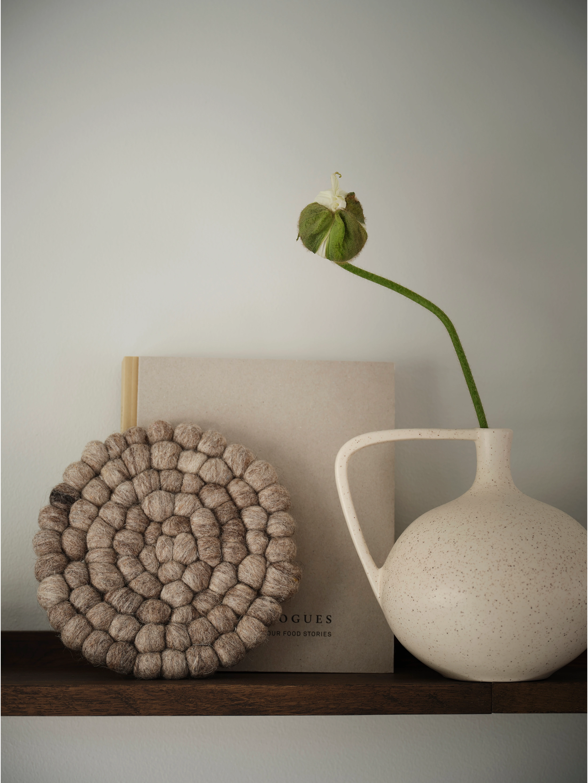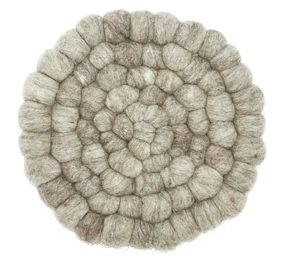 Grytunderlägg i ull med tovade bollar, för att skydda bordet mot varma kärl.