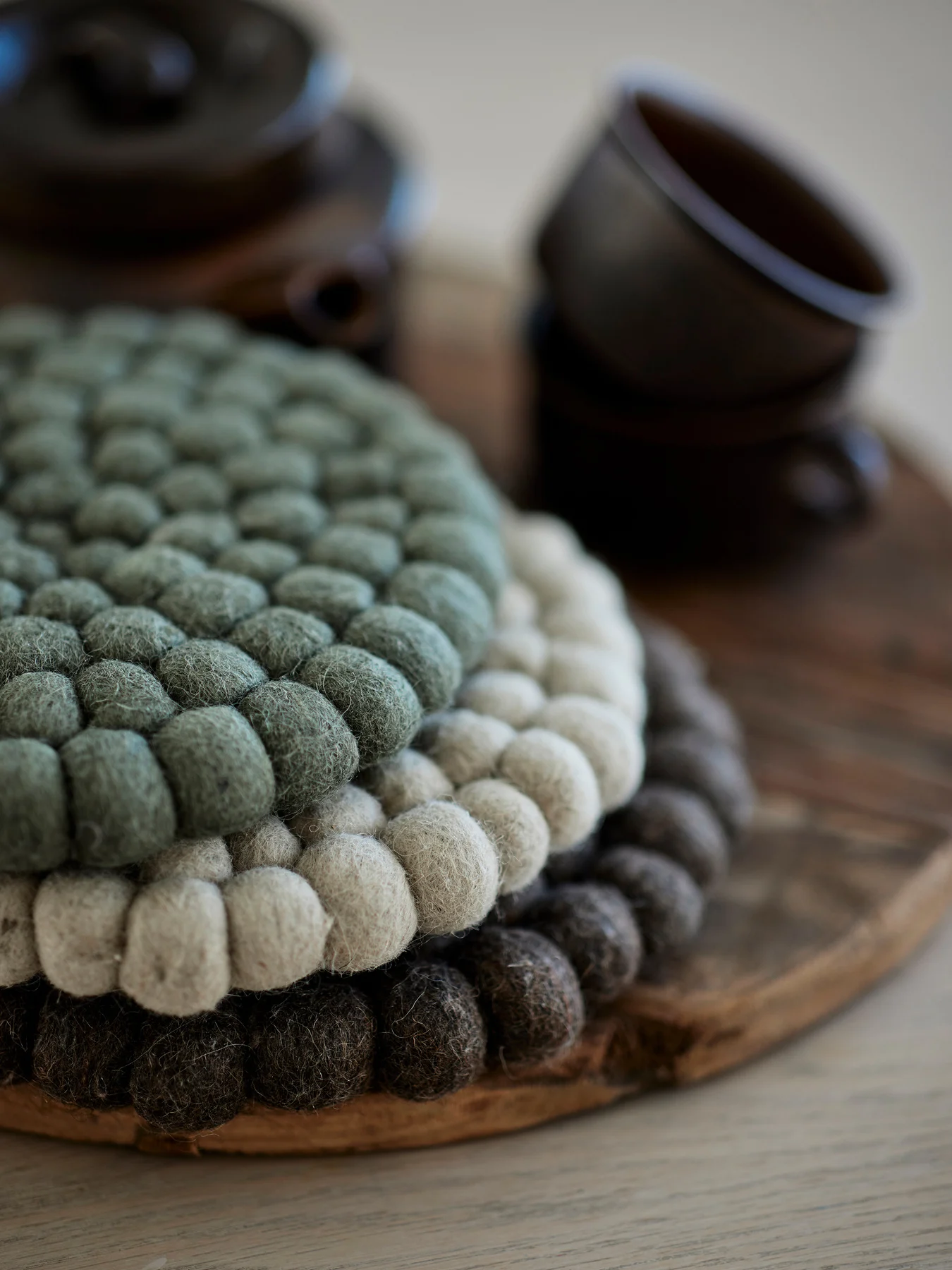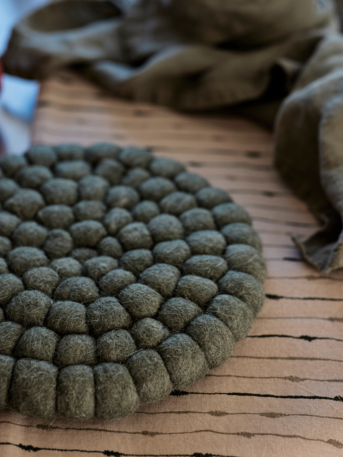Grytunderlägg i ull med tovade bollar, för att skydda bordet mot varma kärl.