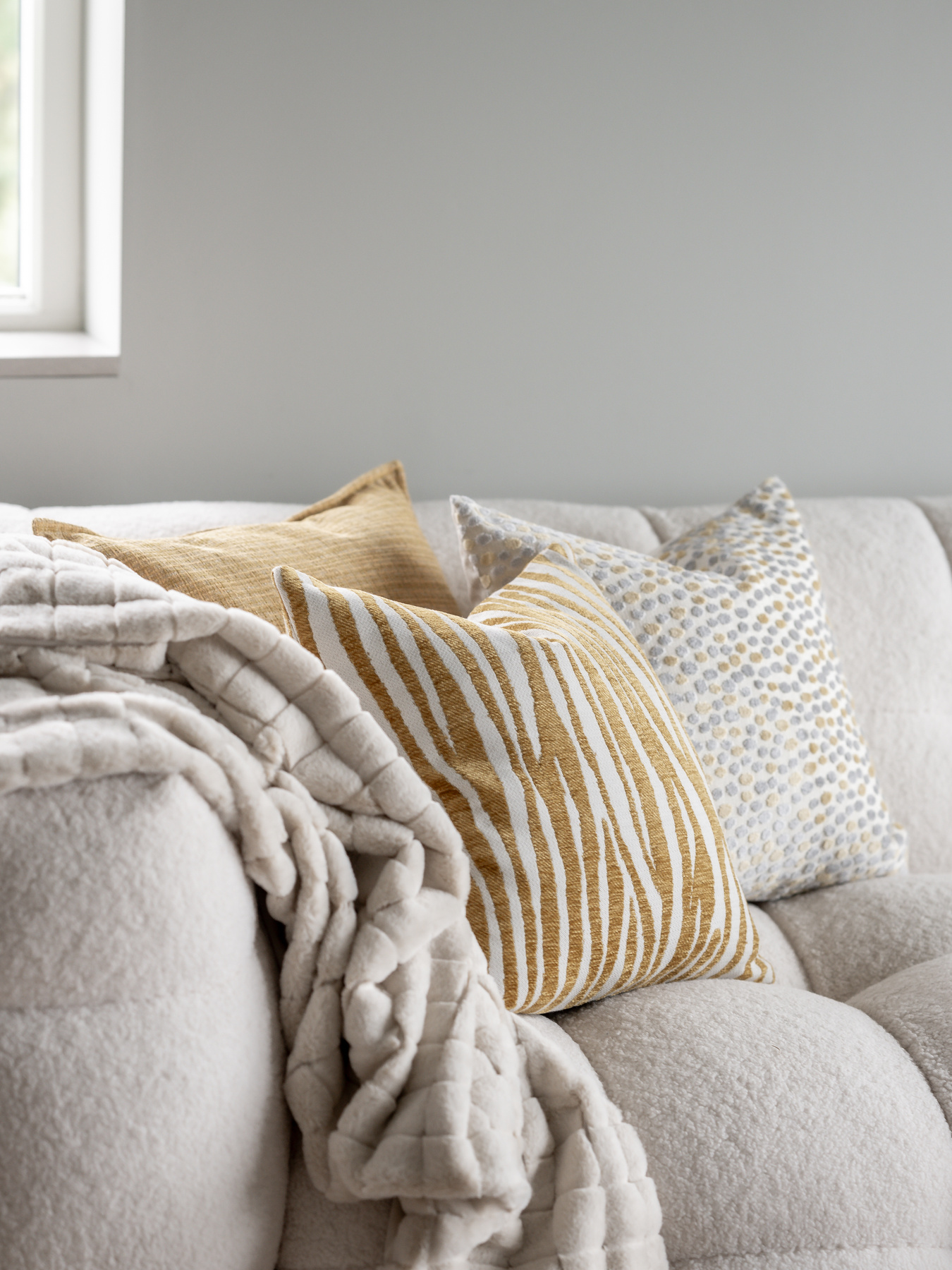 Jacquardvävt kuddfodral med bouclegarn och diskret mönstring som ger liv till tyget. Smal dekorsöm längs alla 4 sidorna för att lyxigt intryck. Dold dragkedja på baksidan. Krymper max 5% vid tvätt. Innerkudde köpes separat.