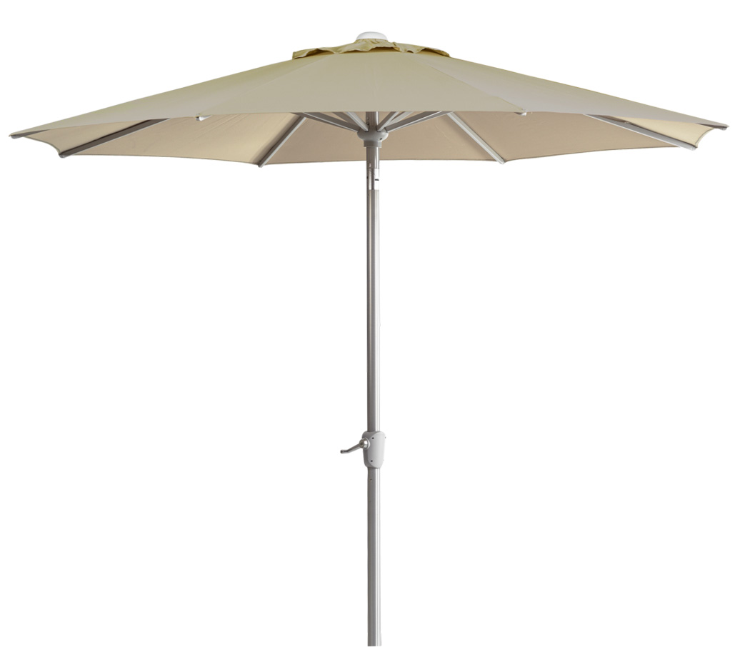 Abriola har en silverfärgad aluminiumstång i två delar med en diameter på 48 mm. Stången är utrustad med en vev och en automatisk tiltfunktion, vilket gör det enkelt att vinkla parasollen. Parasollens tak är tillverkat av 250-grams lösningsfärgat tyg, komplett med en ventilationsöppning, och stöds av 8 ribbor.