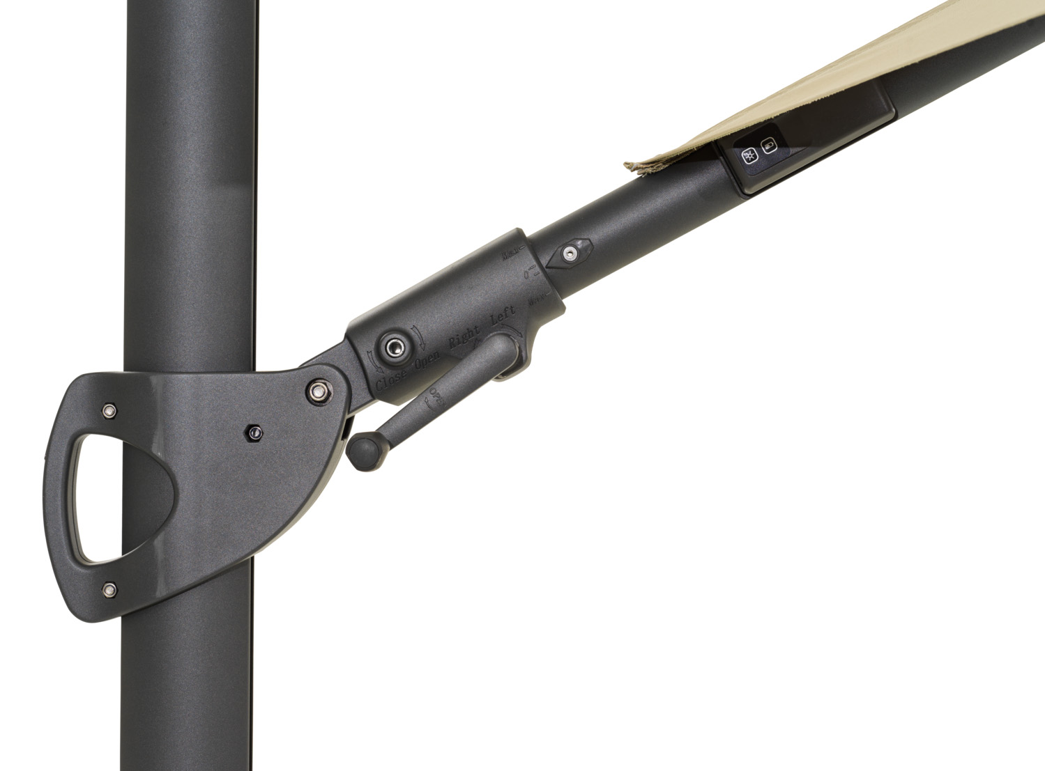 Skuggiga dagar. Upplysta nätter. Cilento är ett elegant parasoll som ger svalkande skugga dagtid och skapar stämning kvällstid med sina inbyggda LED-lampor längs ribborna. Det fristående parasollet har ett 250 g kapelltyg (solution dyed) aluminiumstativ med vev, lutning och steglös kontroll för enkel justering. Med ett knapptryck på kontrollen tänds belysningen och sprider ett behagligt sken utan att blända. Basen är inkluderad men måste förankras med parasollfotsvikter eller liknande.