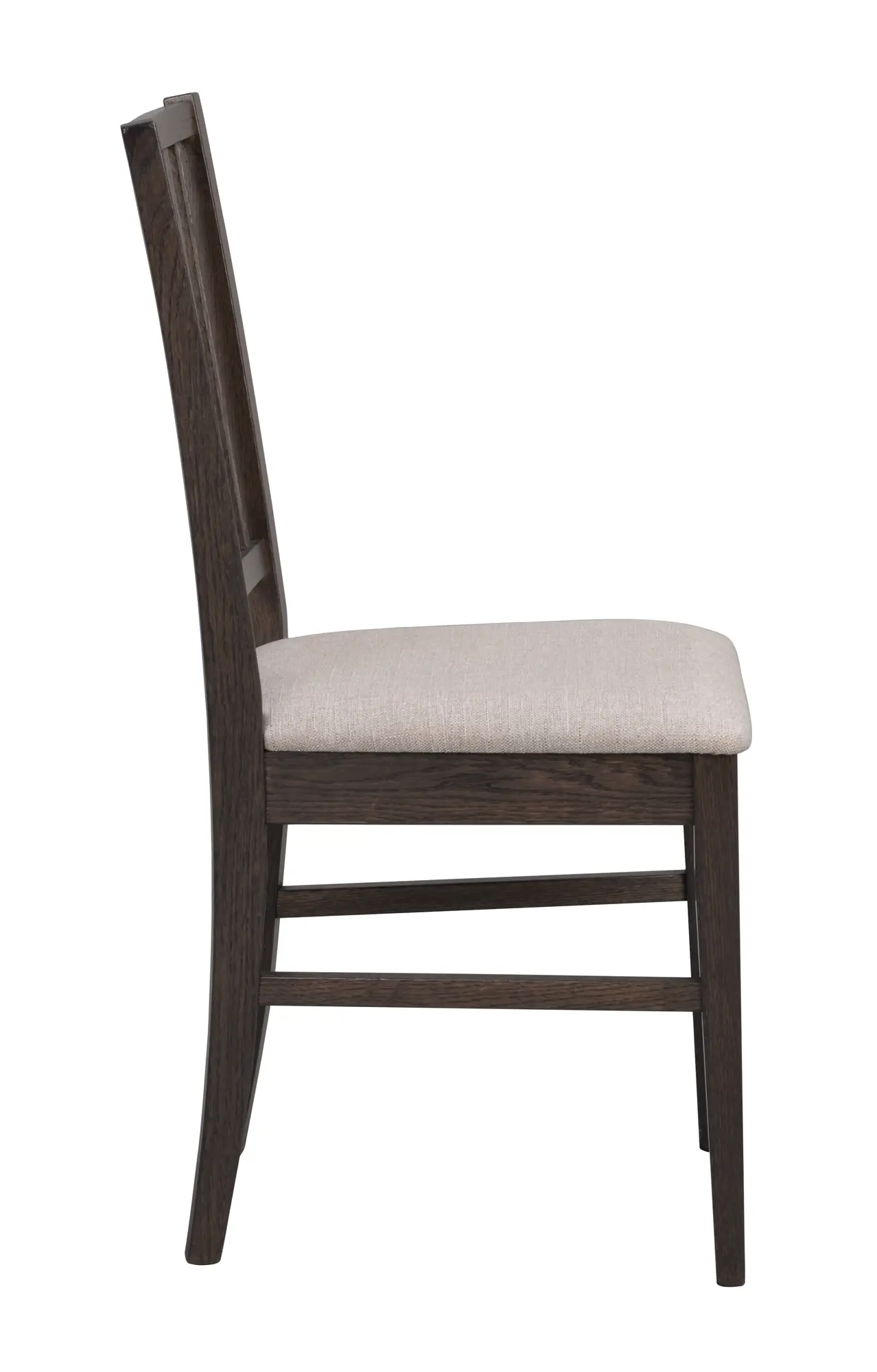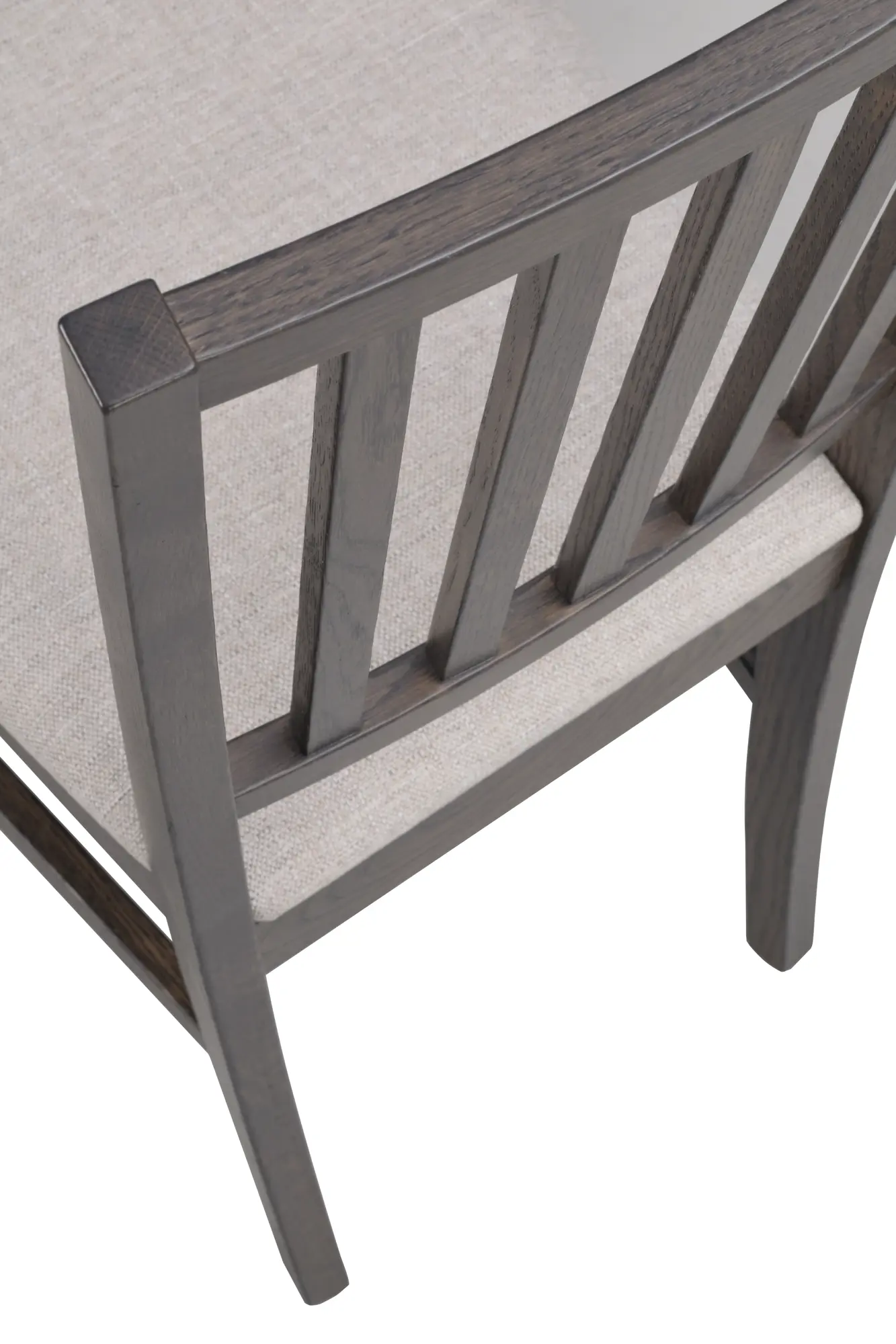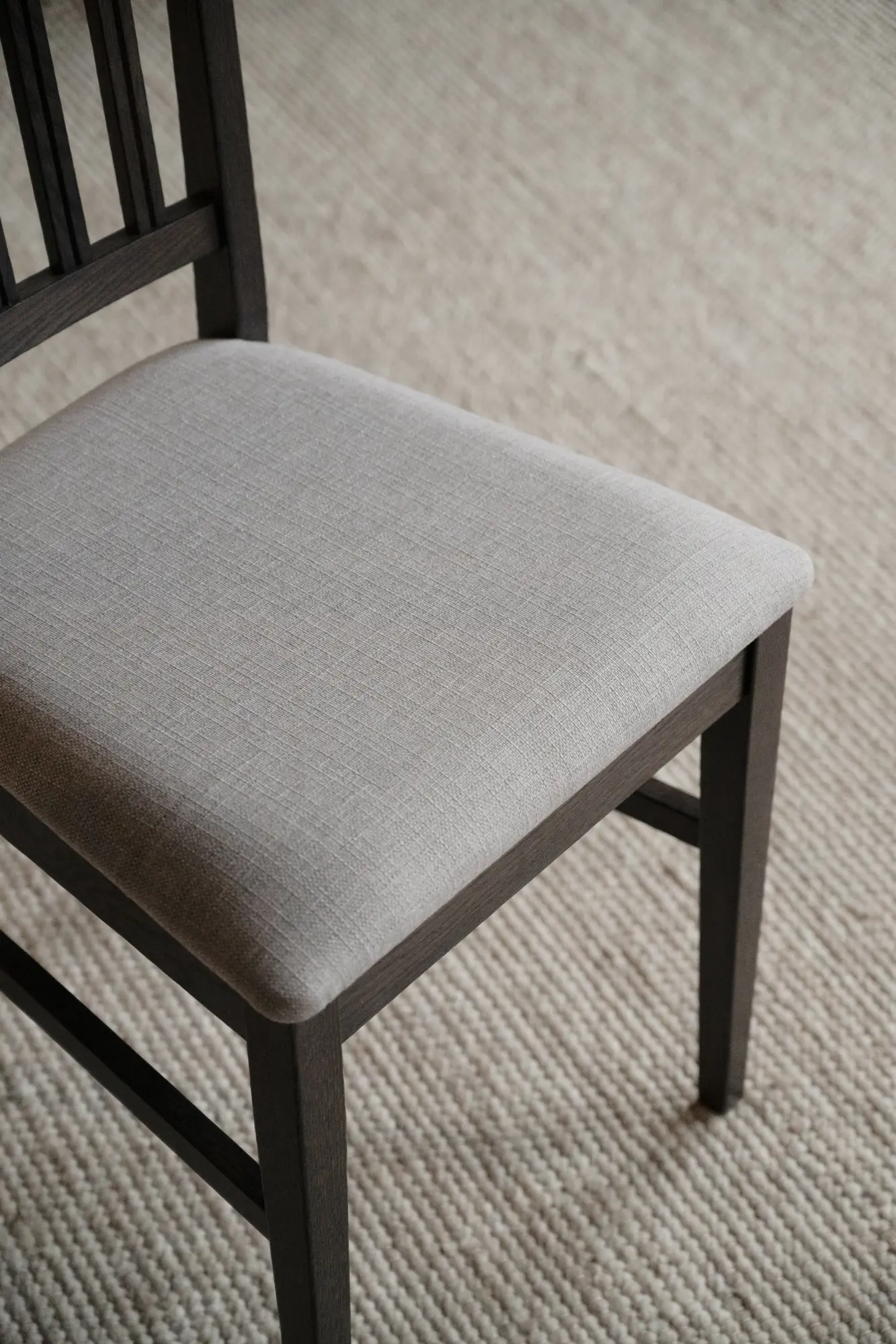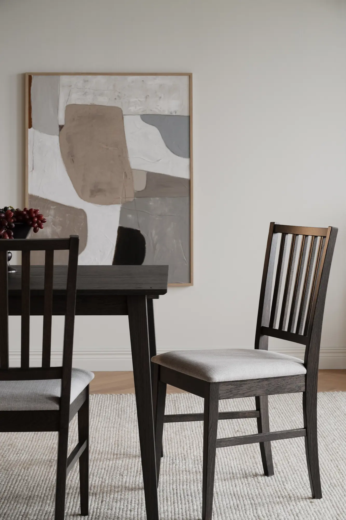 Den stoppade sitsen i beige textil skapar en elegant kontrast till ekens tydliga linjer och erbjuder en bekväm sittupplevelse som lämpar sig väl för långa middagar och sociala stunder runt bordet. Textilens mjuka toner bidrar till ett lugnt och inbjudande helhetsintryck som lyfter både stolens design och rummets atmosfär.