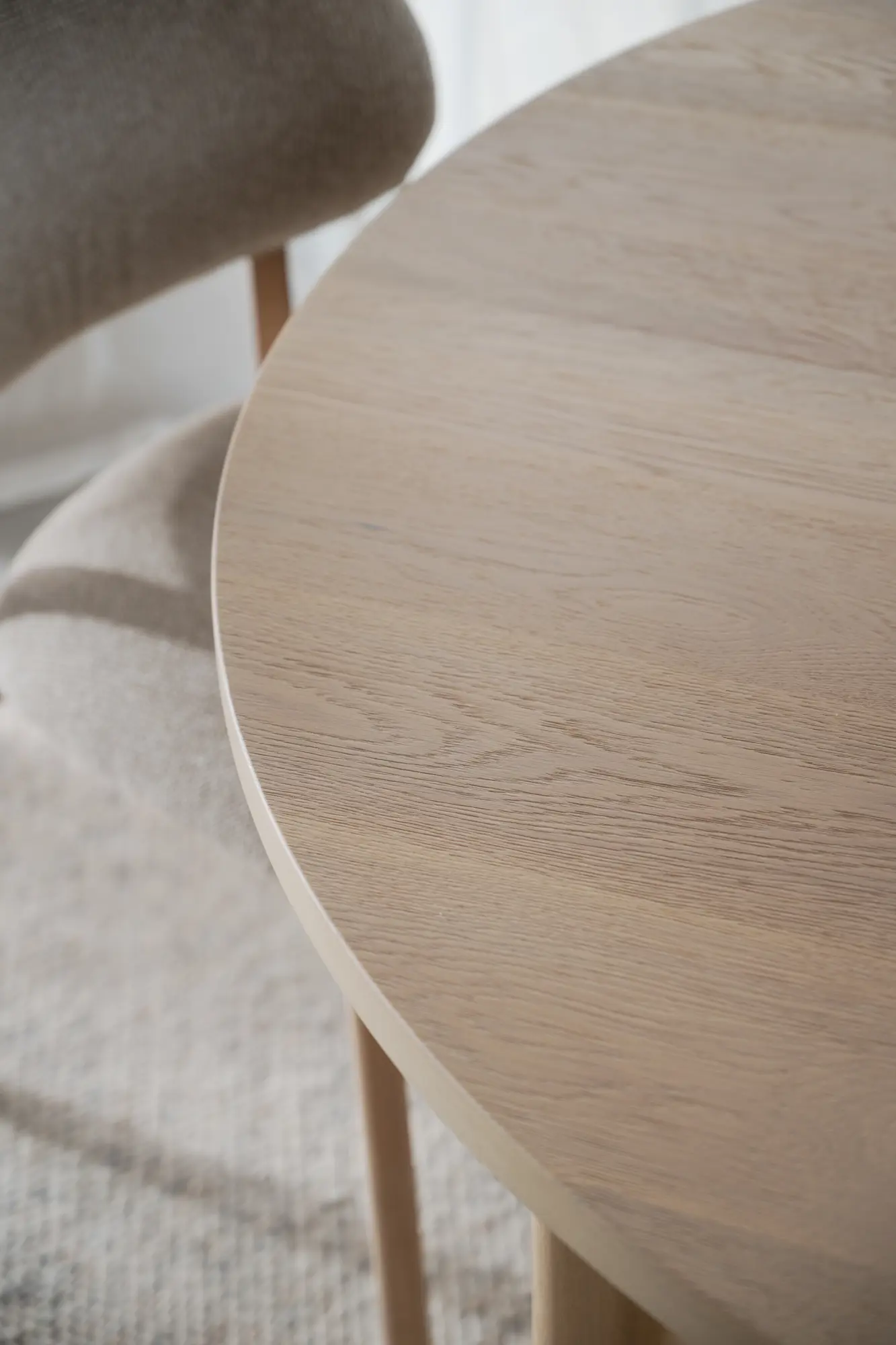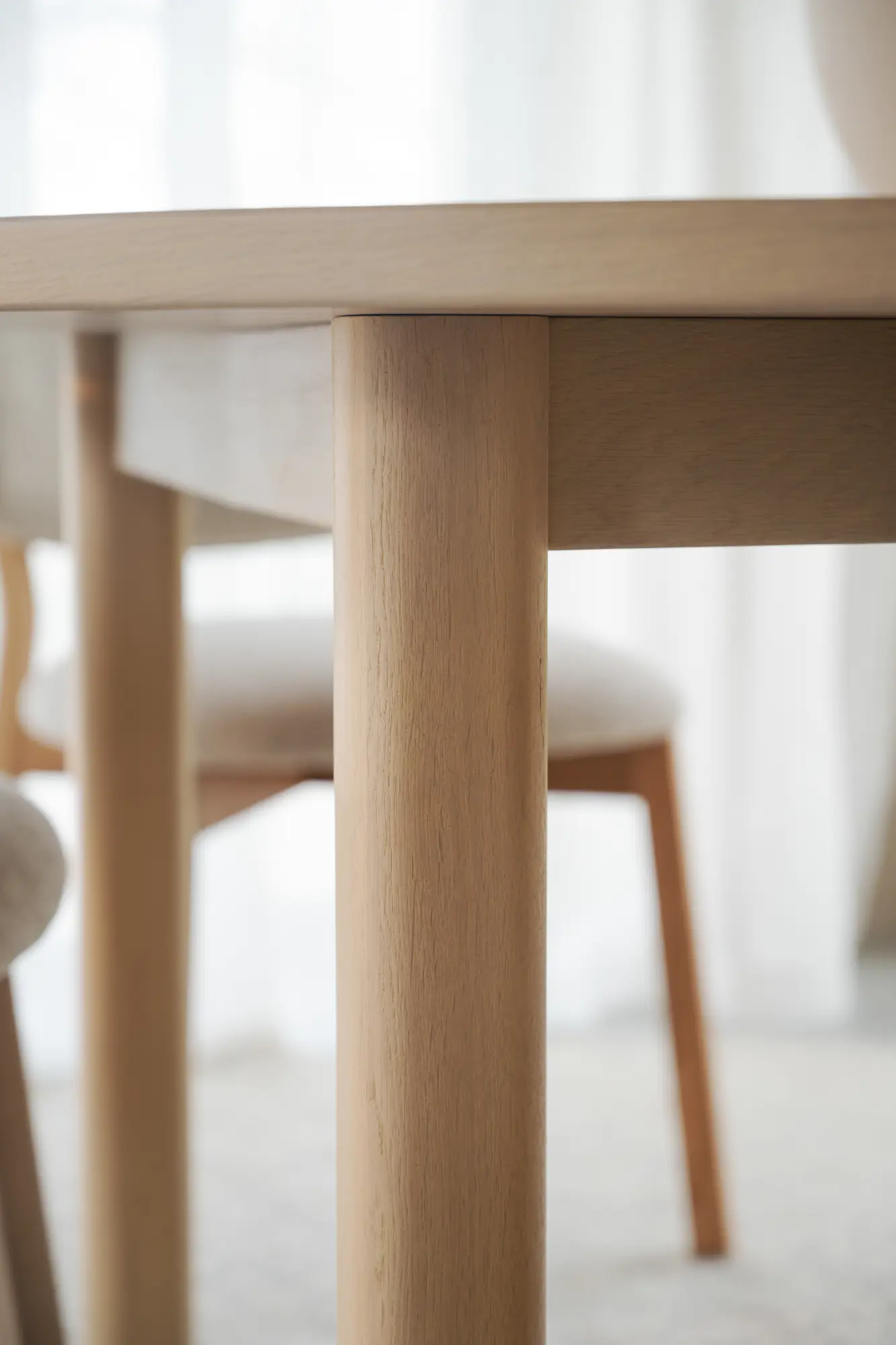 Gifford är ett ovalt matbord i vitpigmenterad semimassiv ek med ett tydligt formspråk och ett högt designvärde. Den ovala bordsskivan skapar ett mjukt och inbjudande uttryck där träets naturliga struktur och färgtoner får ta plats. Den bearbetade ytan lyfter fram ekens variationer och ger bordet en varm och levande karaktär som känns lika modern som tidlös. Att bordsskivan även är semimassiv innebär att toppen består av 3 mm massiv ekfaner.