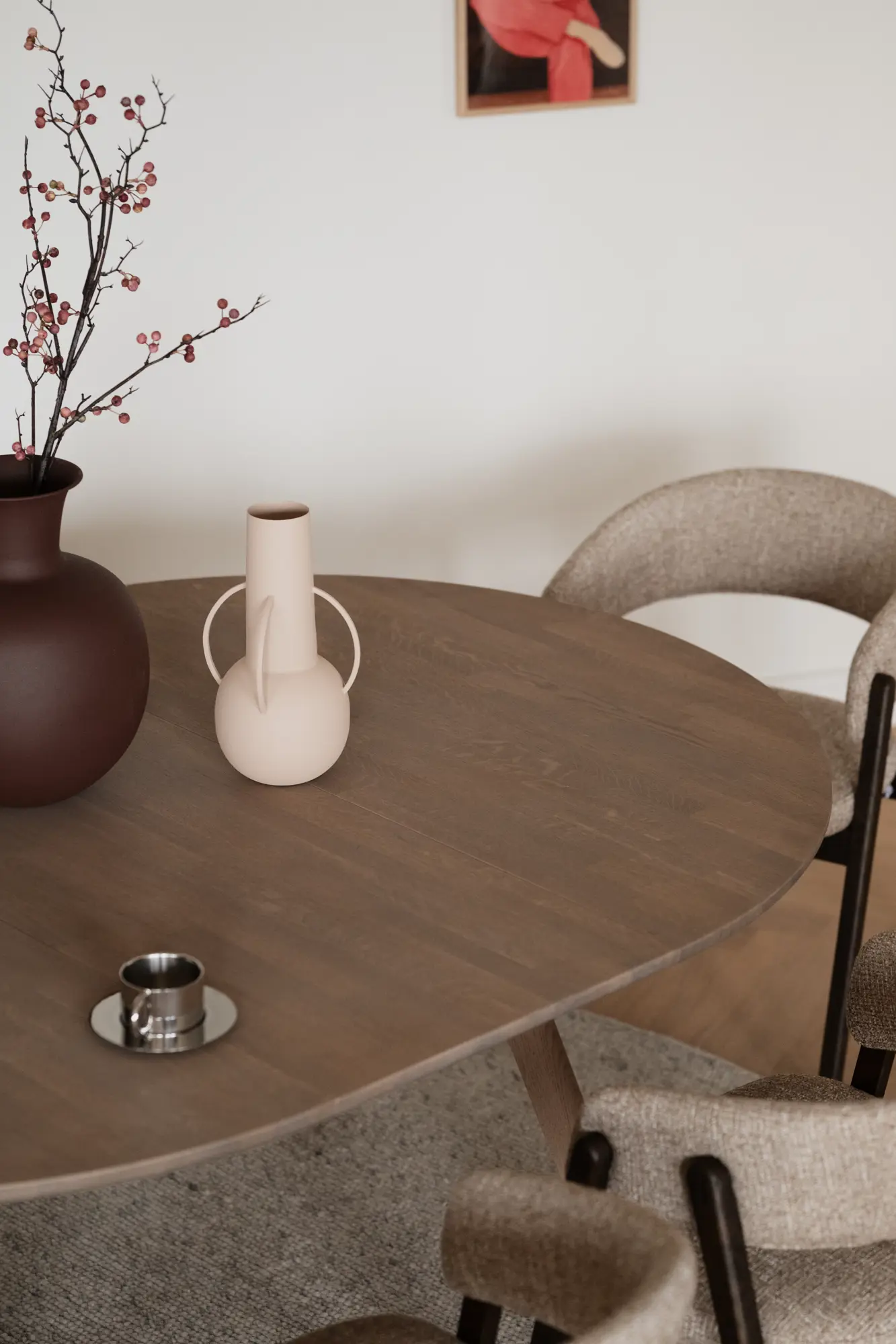 Designen balanserar harmoniskt mellan raka och mjukt rundade linjer, vilket ger bordet en modern men ändå tidlös känsla. De utställda benen möts i ett elegant snitt där benparet förenas till ett gemensamt stycke – en subtil, men sofistikerad designlösning som förstärker bordets uttryck.