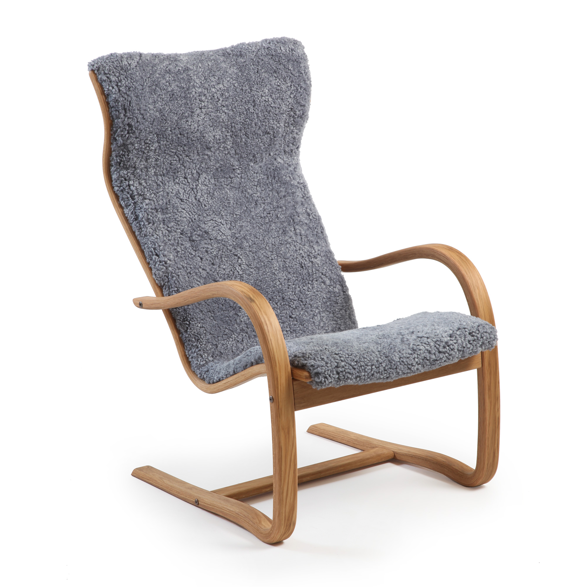Fåtölj Gazell, en härlig fåtölj med ”svikt” funktion. En klassisk svensk tillverkad fåtölj, med hög komfort. Klädd i fårskinn med ben i oljad ek. Fårskinnet finns i fler färger. Till fåtöljen finns även en matchande fotpall.