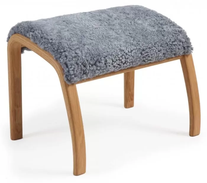 Fotpall till fåtöljen Gazell, 4-bens pall. Klädd i fårskinn med ben i oljad ek. Fårskinnet finns i fler färger samt kan stommen beställas i svartbetsad ek.