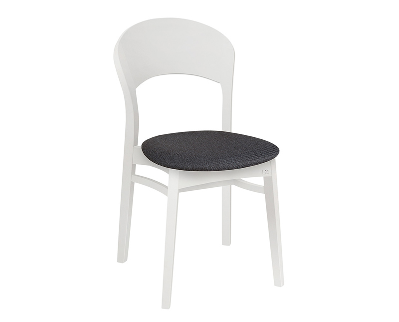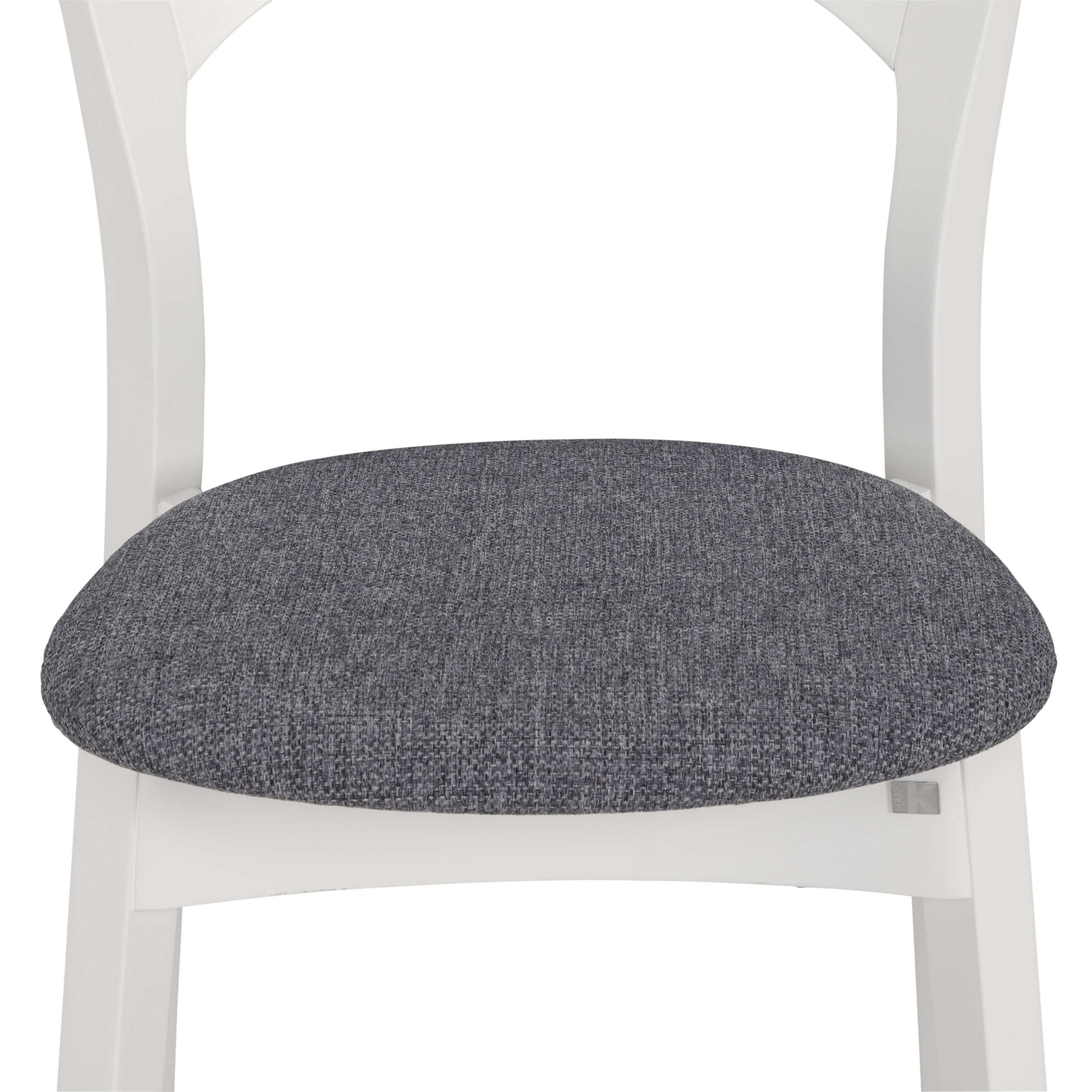 Här i massiv vitlackad björk/MDF med tygsits nature gråmelerad.