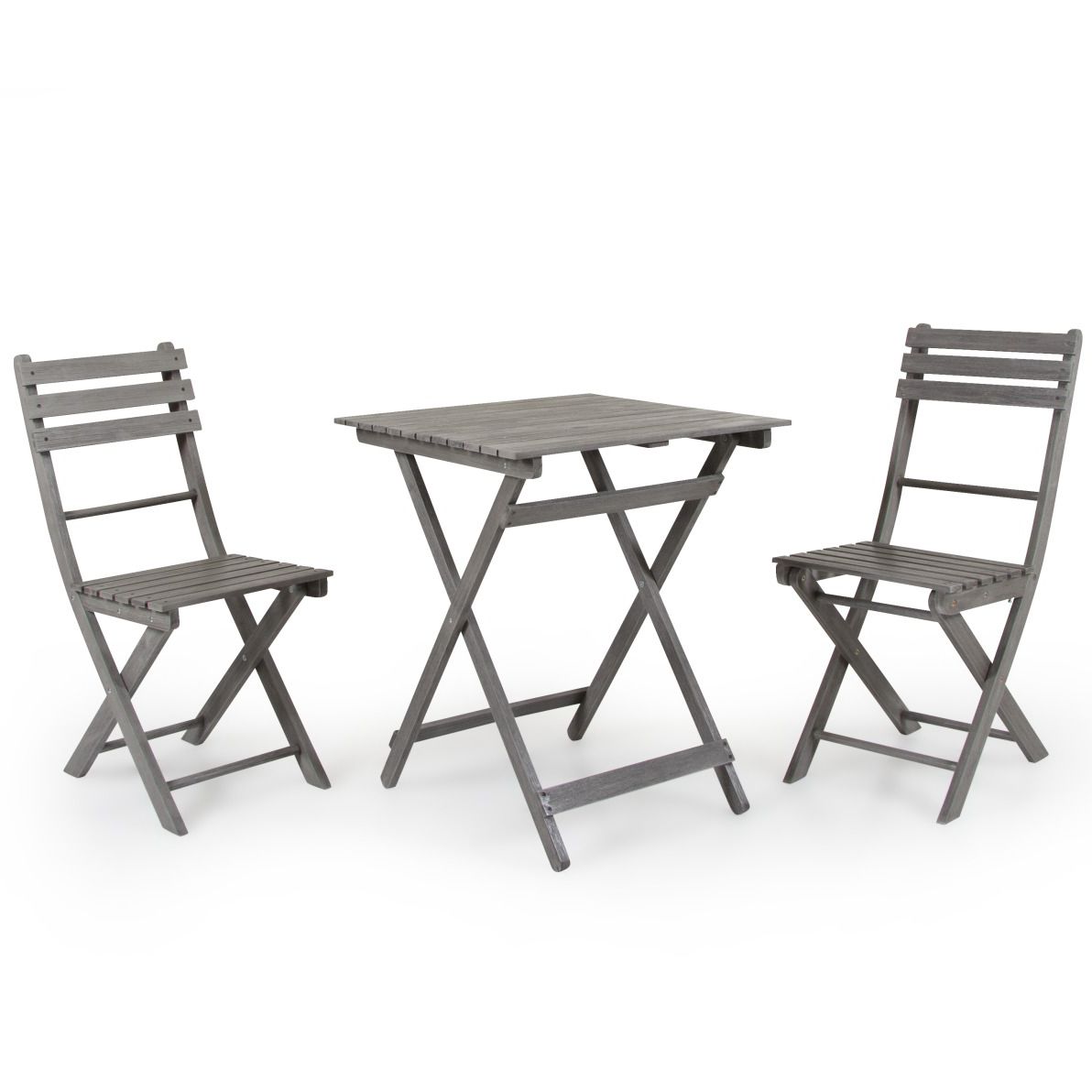 Klassiskt fällbart caféset (2 stolar och 1 bord) i akacia, i en grå väderbeständig kulör.