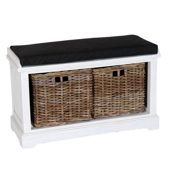 Sittbänk Lydia i målad vit med svart dyna. 2 korgar i naturfärgad rotting.