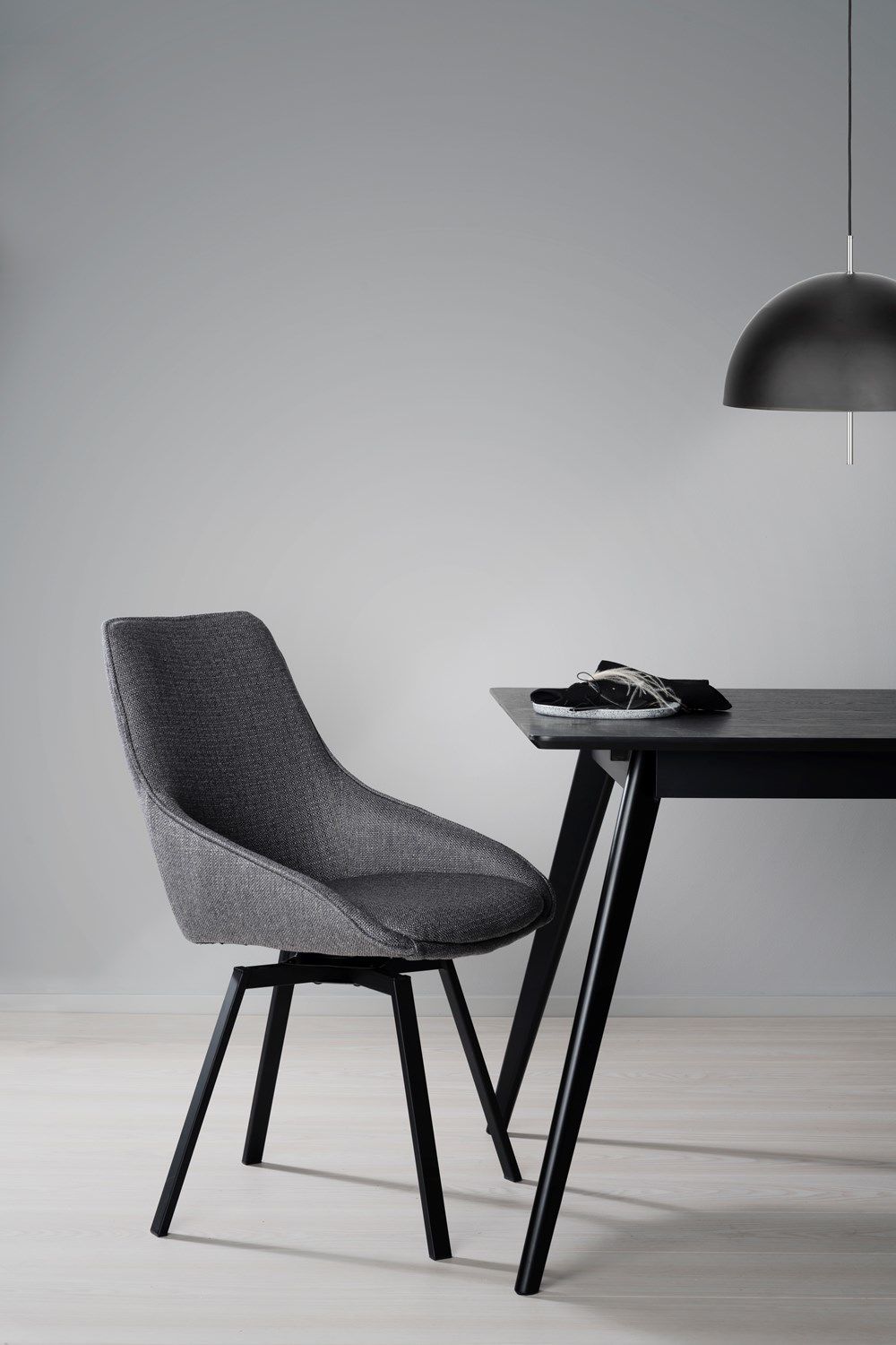 Populära Alison stol med underrede som har snurrfunktion. Här syns den i ett tåligt grått tyg och med ben i pulverlackad svart metall. Alison har en stoppad sits med hög sittkomfort i kupad design och ben med snurrfunktion i 360 grader. Stolen passar perfekt runt matbordet men även som udda stol till skrivbordet. Alison finns även i andra jordnära färger.