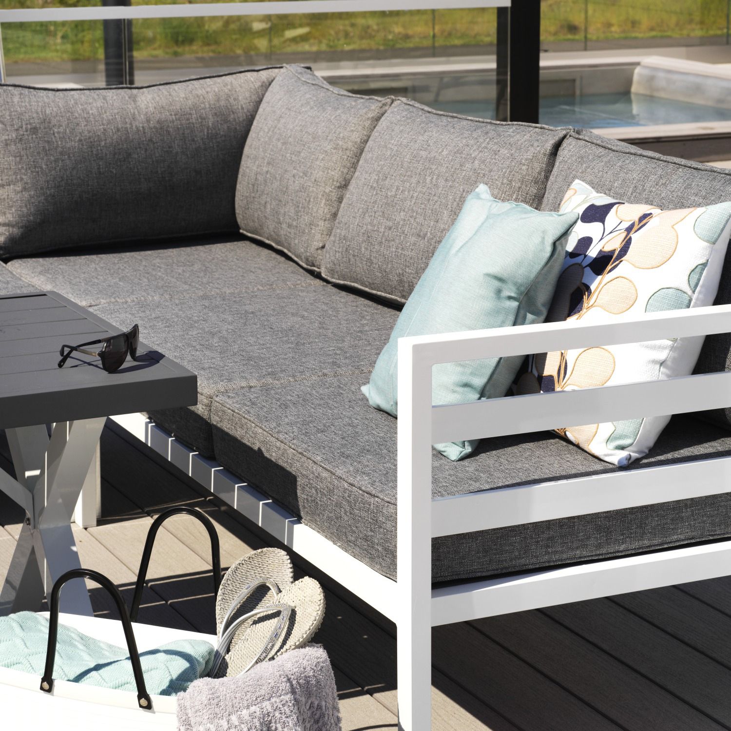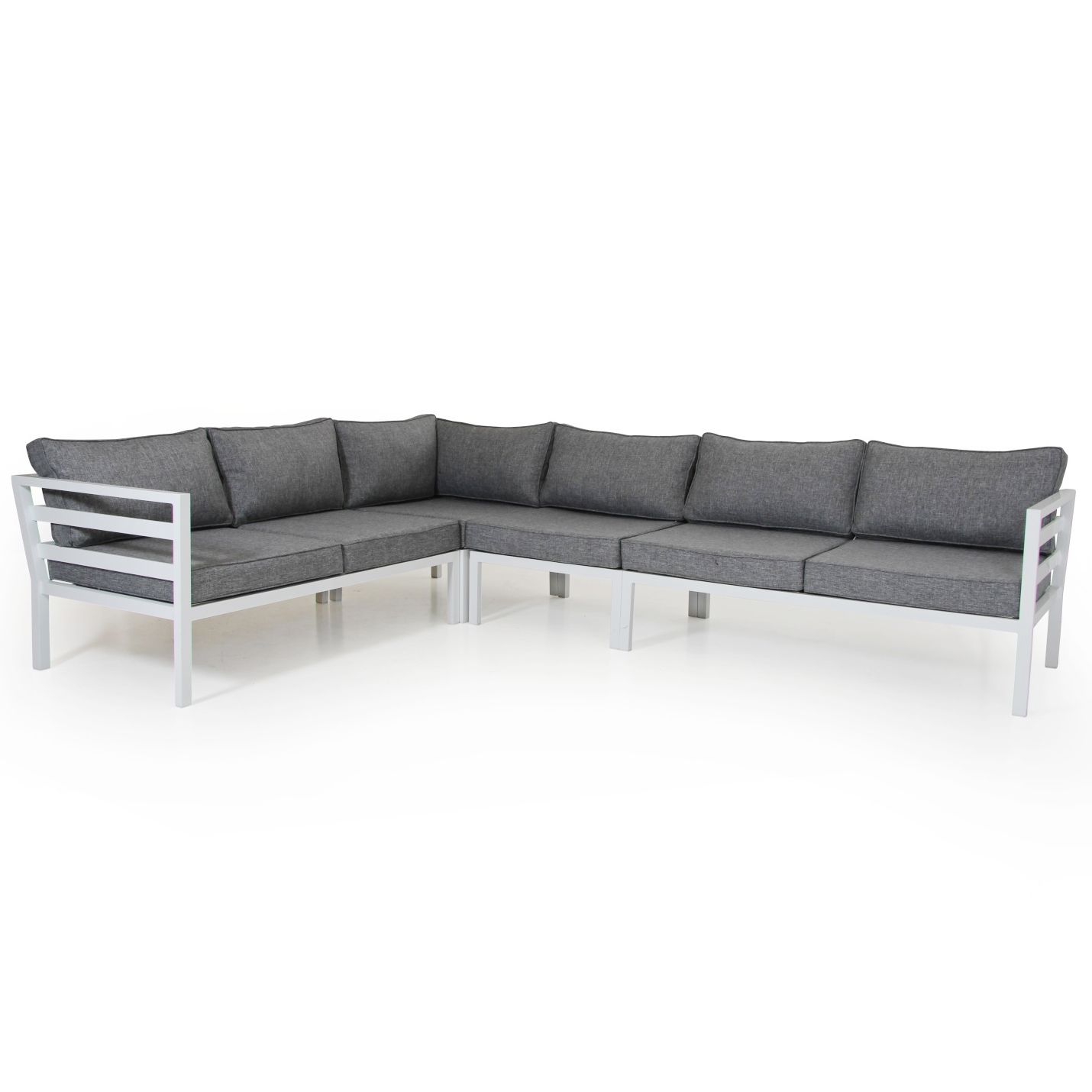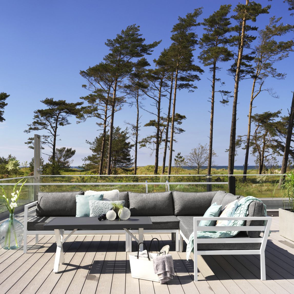 Weldon hörnsoffa 2H2. Bekymmersfri sommar med allvädersdynor! Med Weldons unika allvädersdynor behöver du inte vara orolig om du glömt dynorna framme under någon av sommarens alla regnskurar. Dynorna torkar snabbt och är gjorda av material som tål utomhusbruk extra väl. En byggbar serie, kan kompletteras med fler mittdelar för en större soffa.